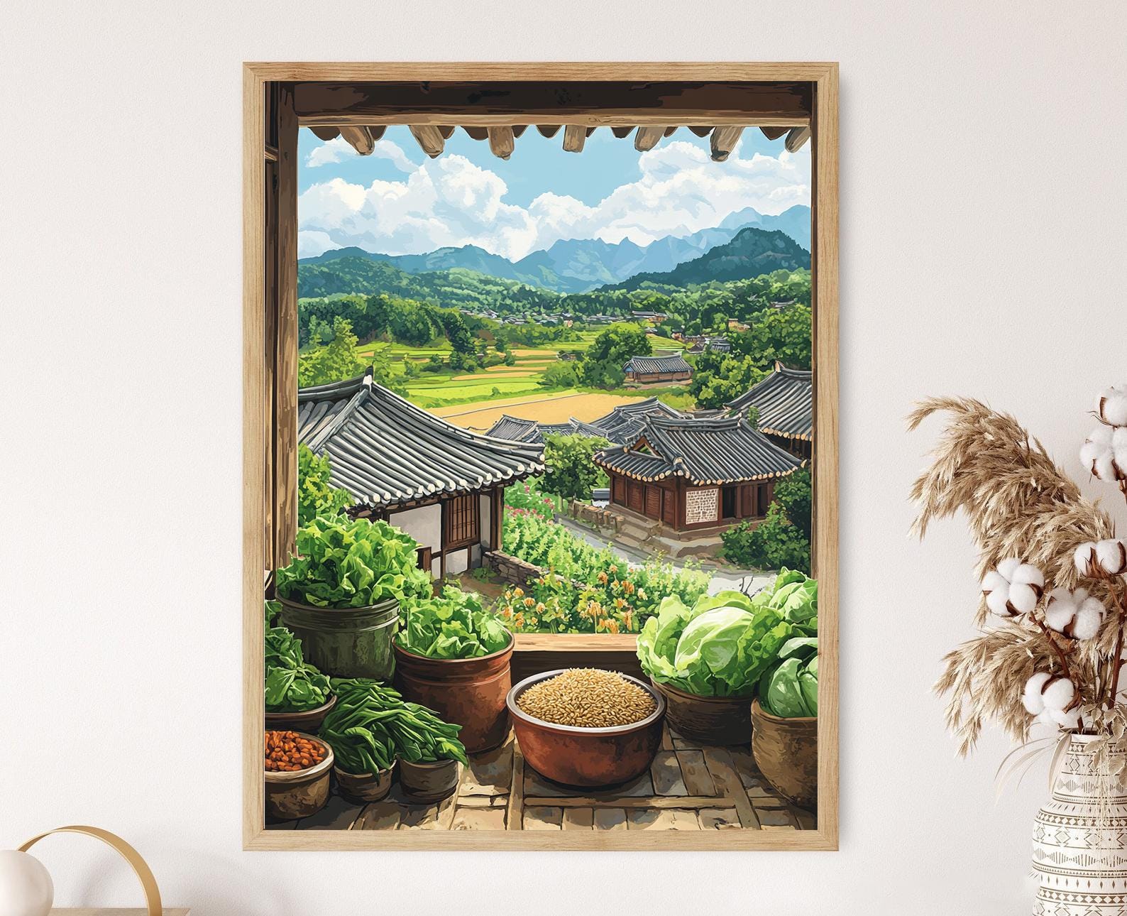 Plongez dans l'héritage culinaire de Jeonju avec cette affiche captivante, mettant en scène une scène de balcon vibrante, où le gochujang, l'orge et le chou s'épanouissent sous les toits historiques des hanok. Cette illustration empreinte de culture asiatique évoque une atmosphère chaleureuse et accueillante, parfaite pour toute décoration murale. Transformez votre espace avec ce poster mural, un véritable art mural qui célébrera la richesse des traditions coréennes.