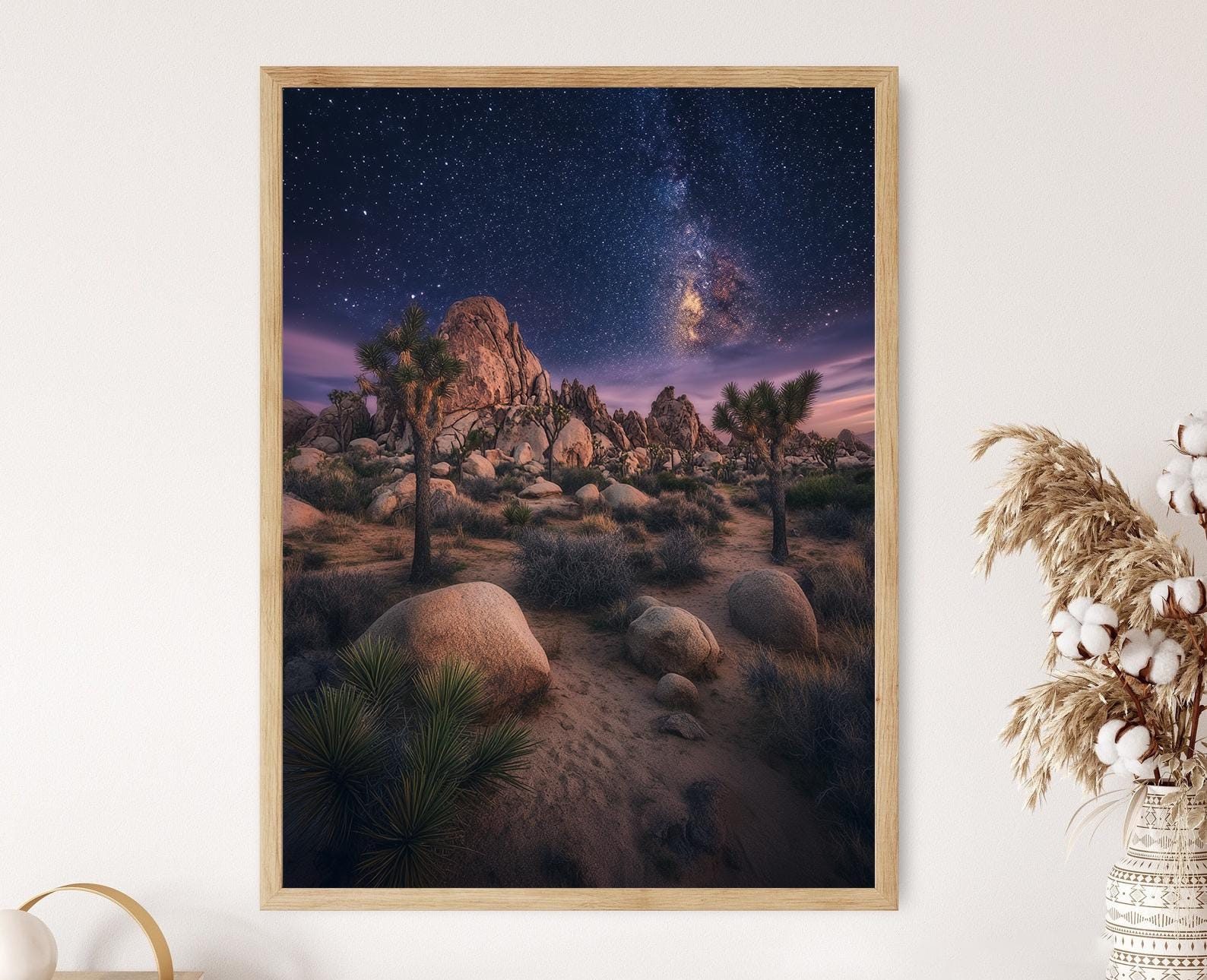 Découvrez notre affiche captivante inspirée du parc national Joshua Tree en Californie. Cette illustration artistique met en valeur les arbres emblématiques de Joshua, les formations rocheuses saisissantes et un ciel étoilé enchanteur, créant une atmosphère mystique qui transformera votre décoration murale. Ajoutez une touche d'émerveillement à votre intérieur avec ce poster mural qui célèbre la beauté unique du désert.