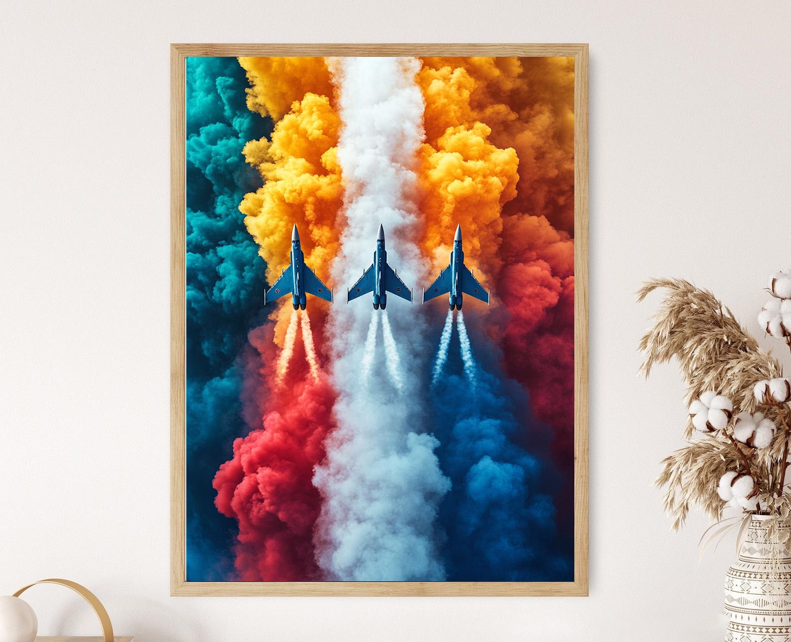 Découvrez cette affiche vibrante qui célèbre la Journée de l'Indépendance de l'Inde à travers une illustration audacieuse. Des avions de chasse s'élancent dans le ciel, laissant derrière eux des traînées de fumée saffran, blanc et vert, symbolisant le tricolore indien. Cette œuvre d'art mural dynamique et patriotique apporte une touche de caractère à votre décoration murale, parfaite pour insuffler une ambiance festive et engagée dans votre intérieur.