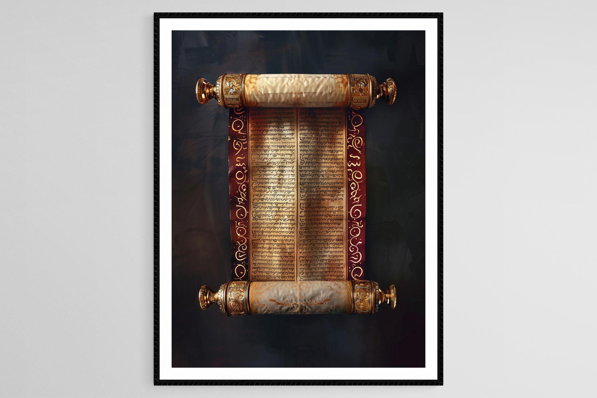 Découvrez notre affiche captivante mettant en avant un rouleau de Torah, symbole puissant de la foi et de l'apprentissage juif. Cette illustration ornée de bordures délicates et de texte hébreu évoque une atmosphère de respect et de spiritualité, parfaite pour enrichir votre décoration murale. Transformez votre espace avec cet art mural chargé de signification et d'émotion.