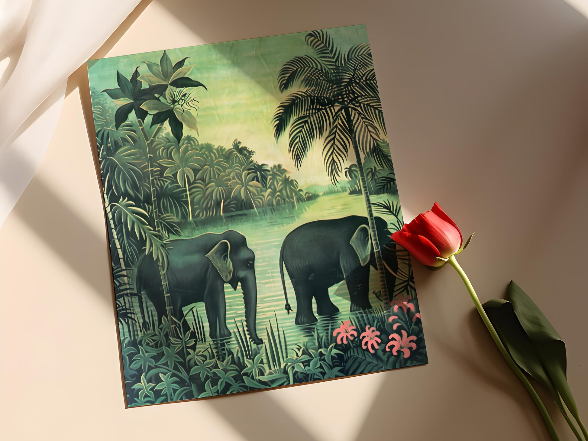 Affiche Jungle Inspirée de Henri Rousseau – Éléphants au Bord de l'Eau