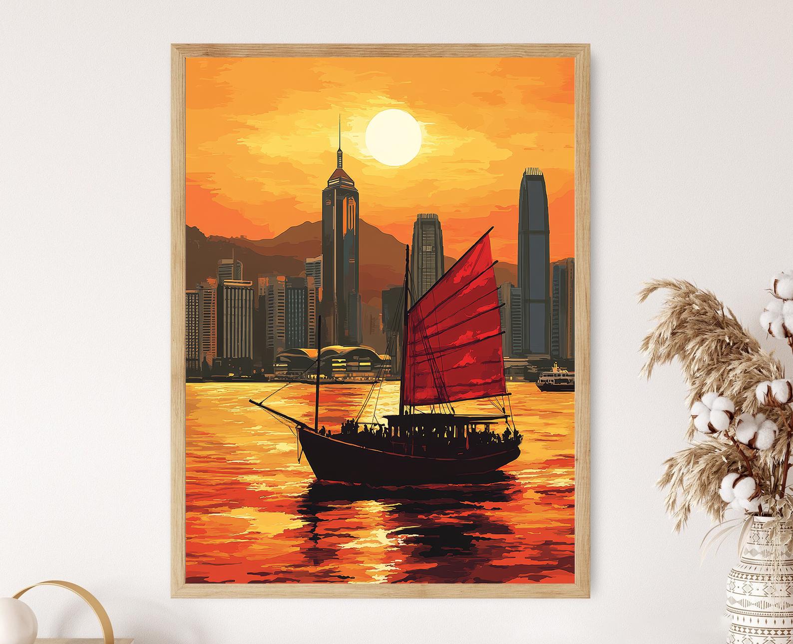 Découvrez cette magnifique affiche qui capture l'essence de Hong Kong, représentant un bateau-junk traditionnel naviguant sur le port de Victoria au coucher du soleil. Cette illustration vibrante évoque une harmonie entre tradition et modernité, apportant une touche de sérénité et d'élégance à votre décoration murale. Parfaite en tant que poster mural, elle transforme n'importe quel espace en une galerie d'art mural inspirante.