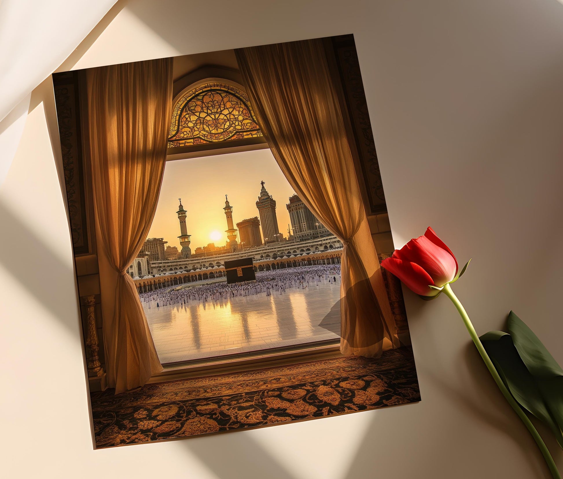 Découvrez cette affiche captivante qui immortalise un moment sacré du matin, présentant une fenêtre ouverte sur la Kaaba. Avec ses rideaux délicats et une lumière douce, cette illustration évoque sérénité et dévotion, faisant de ce poster mural une pièce de choix pour toute décoration murale. Idéale pour apporter une touche d'art mural inspirante à votre intérieur.
