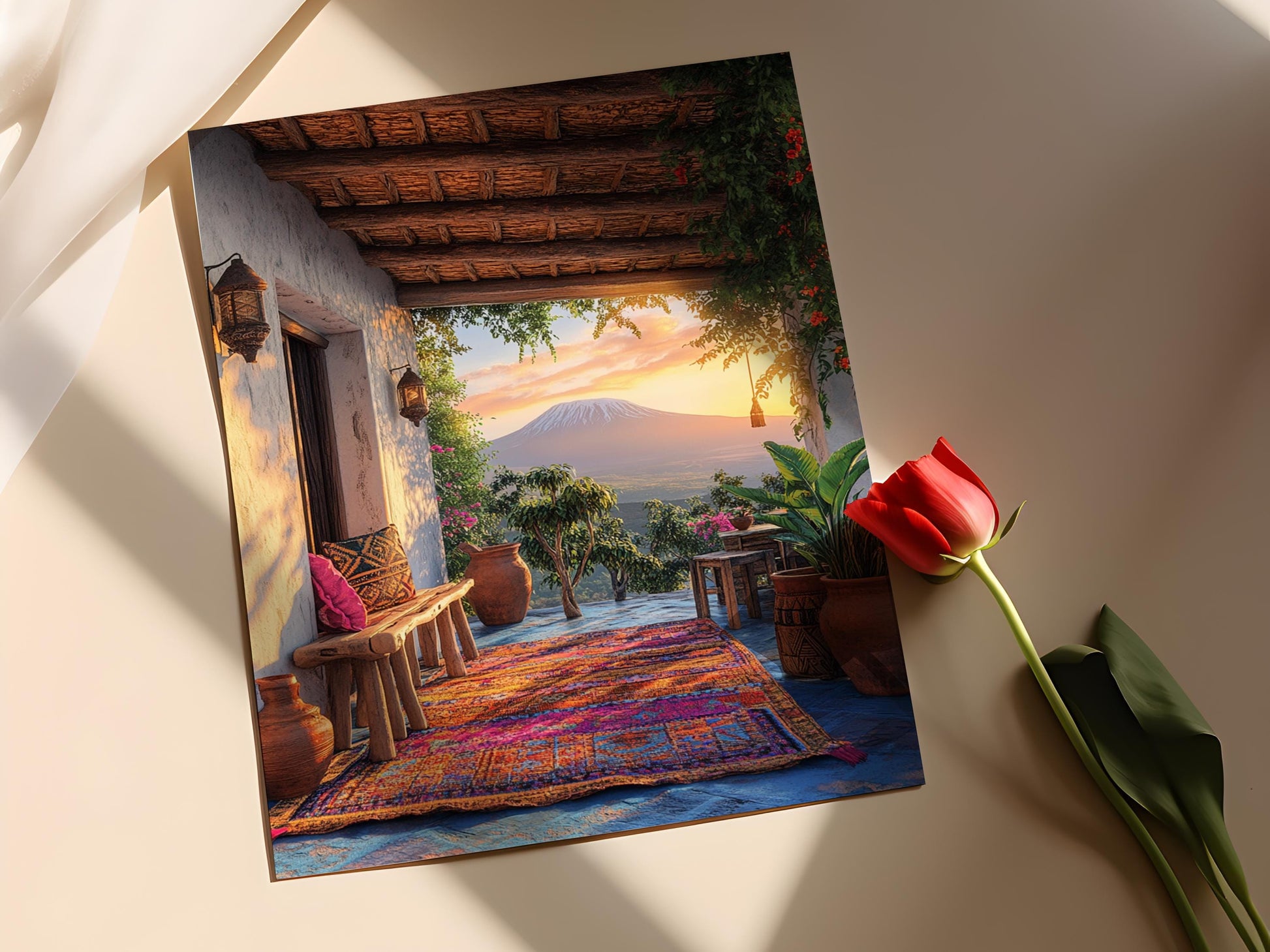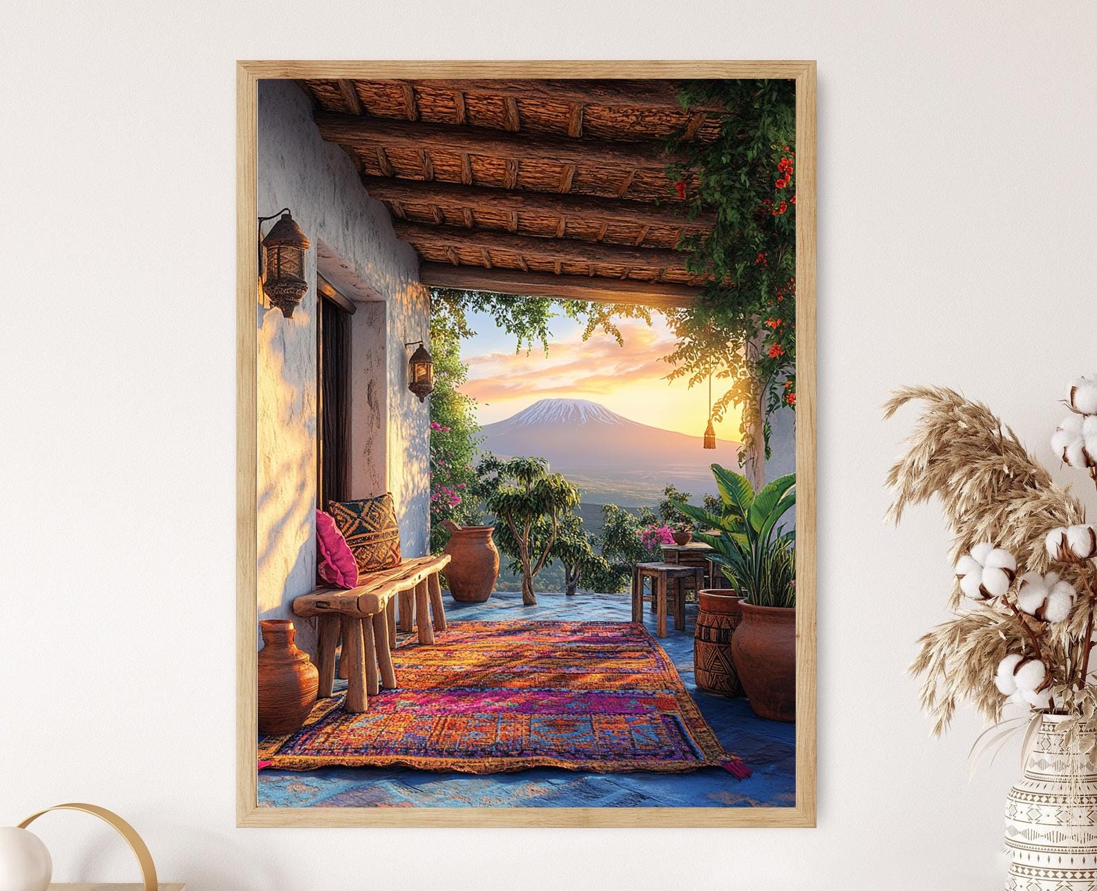Découvrez cette affiche captivante qui met en avant un patio tanzanien, riche en couleurs et en textures. Avec ses textiles kanga vibrants, ses tabourets sculptés et ses plantes baobab en pot, cette illustration évoque la chaleur et l'authenticité de la culture tanzanienne. Ajoutez une touche d’évasion à votre décoration murale avec ce poster mural qui célèbre la beauté naturelle et l'esprit vivant de la Tanzanie.