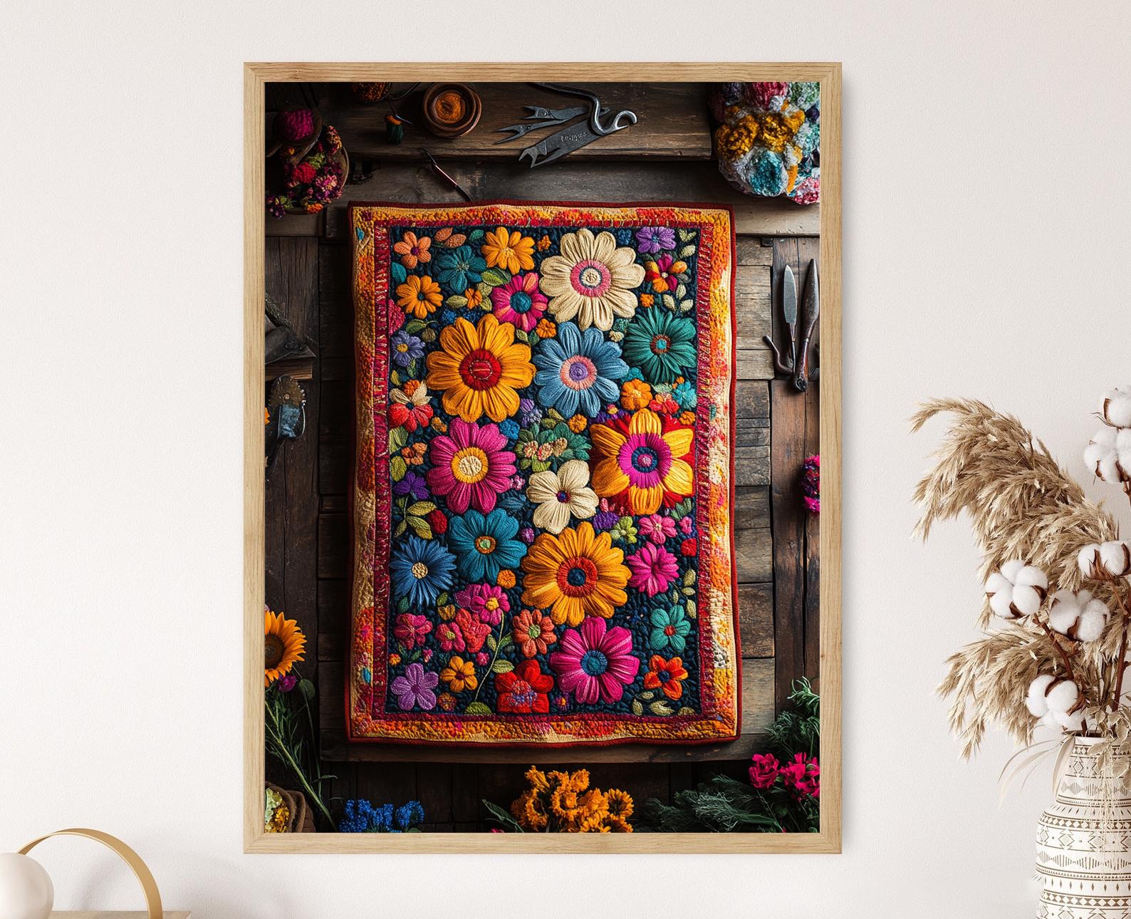 Affiche Kantha Indienne – Poster Art Floral & Géométrique Textile