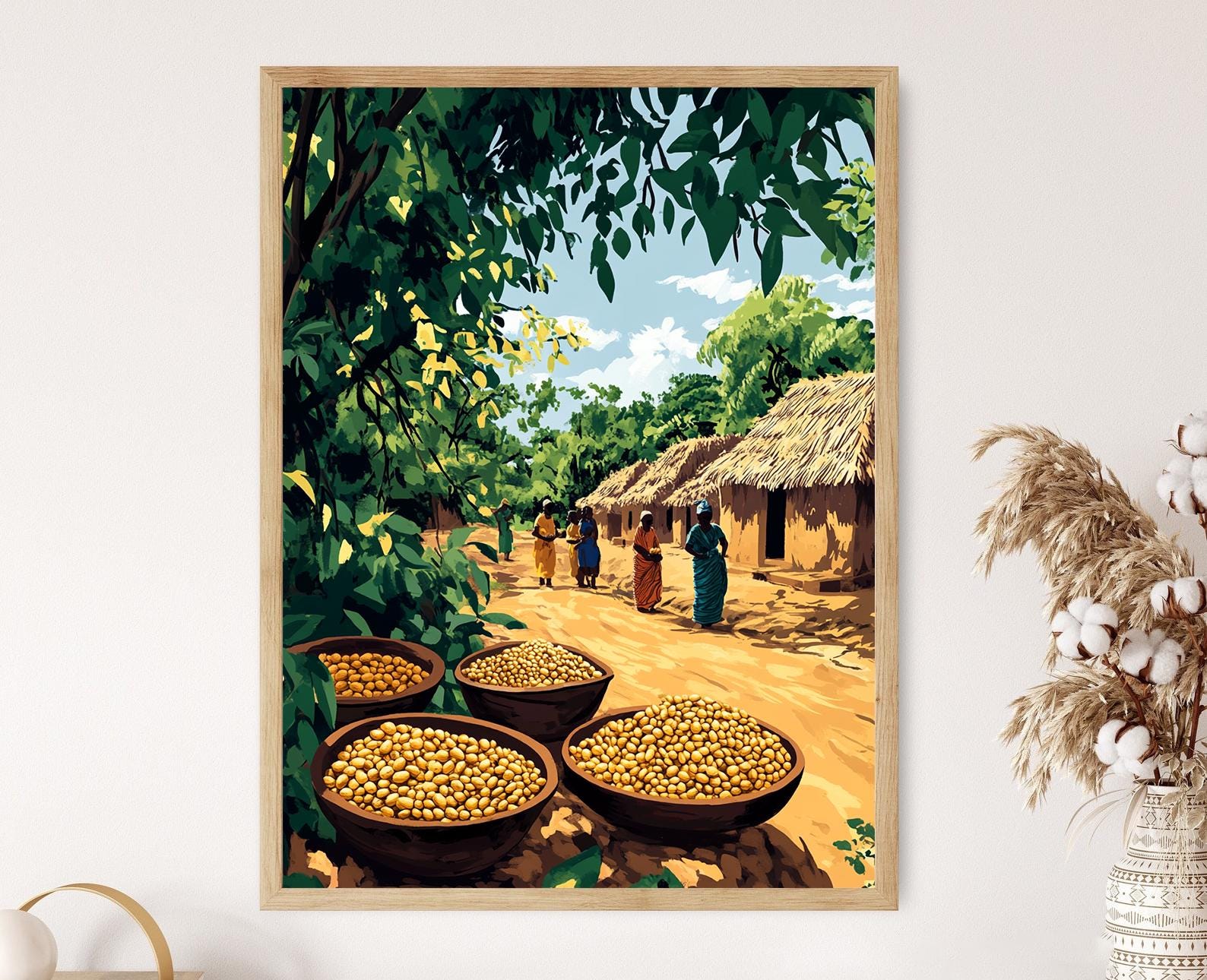 Découvrez notre affiche captivante qui met en lumière la production traditionnelle de beurre de Karité au Burkina Faso. Cette illustration vibrante, représentant des femmes au travail dans un village luxuriant, célèbre l'authenticité et la richesse des savoir-faire africains. Parfaite comme décoration murale, ce poster mural apporte une touche d'émotion et de culture à votre art mural.