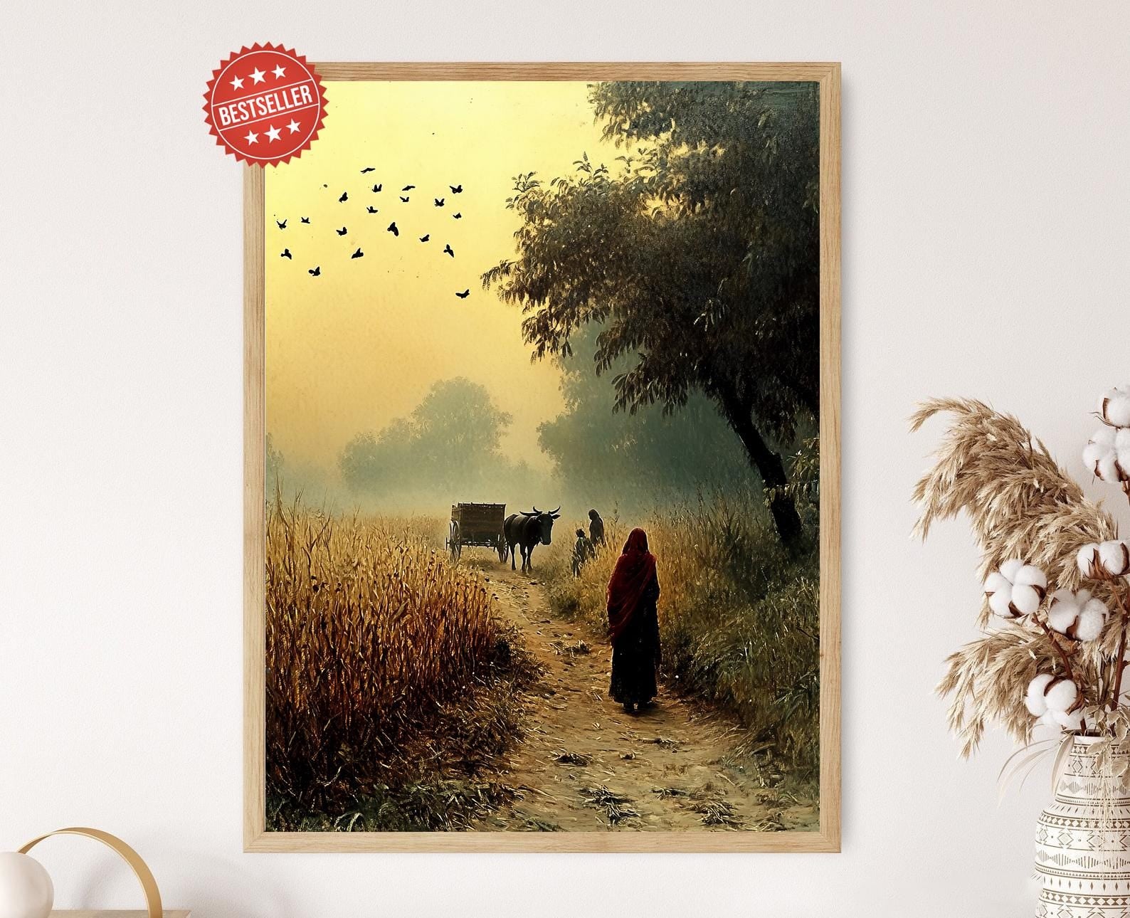 Découvrez cette magnifique affiche qui évoque la sérénité rurale du Punjab. L'illustration met en scène des femmes s'occupant des cultures dans un khet traditionnel, tandis qu'un chariot à bœufs émerge à travers la brume matinale. Cette décoration murale capturera l'essence paisible de la vie agricole, apportant une touche de beauté et de simplicité à votre art mural.