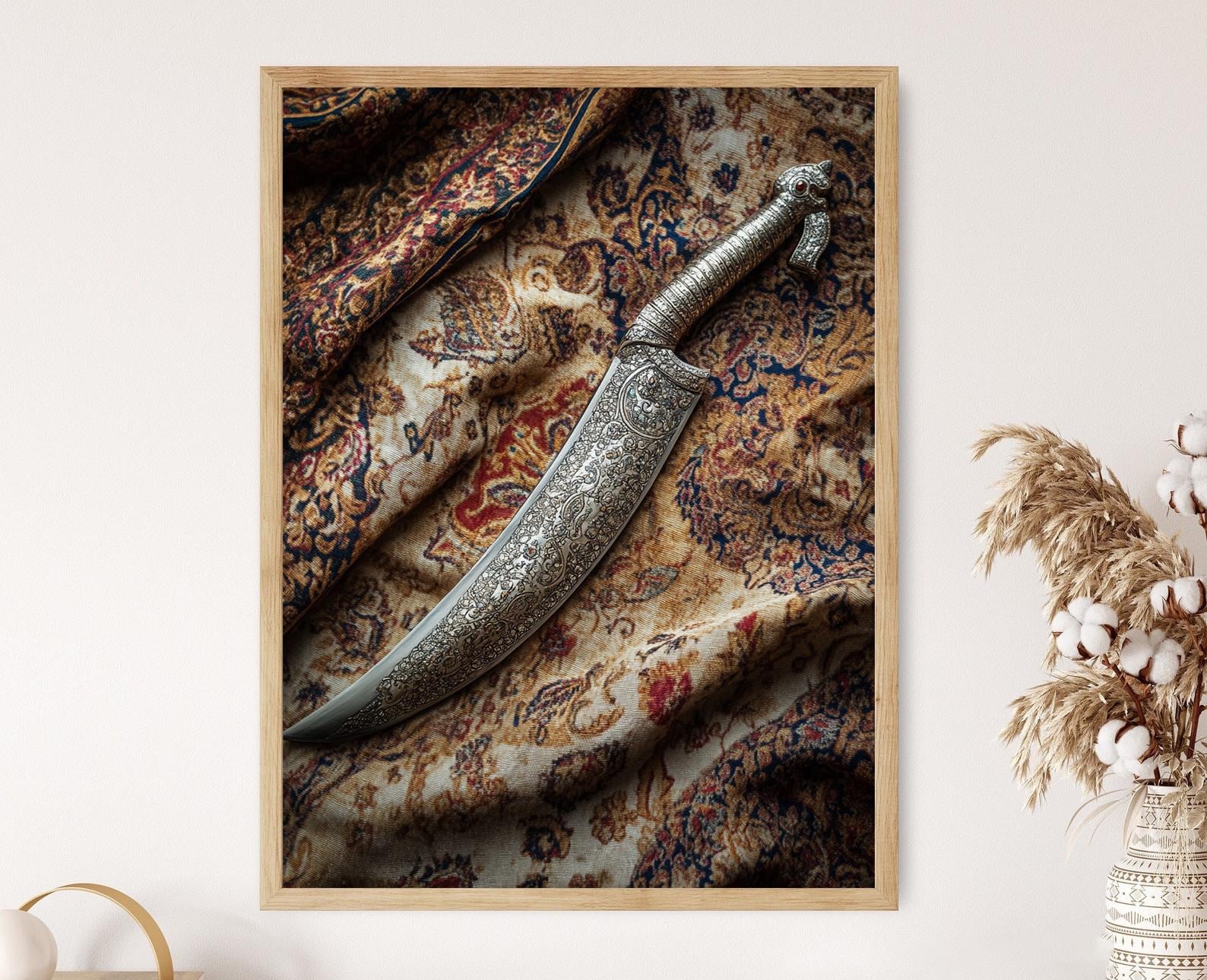 Découvrez notre magnifique affiche mettant en avant un poignard Sikh Kirpan délicatement posé sur un textile indien orné. Cette illustration captivante allie l'élégance des gravures détaillées du Kirpan à la richesse des motifs du tissu, créant ainsi une décoration murale empreinte de tradition et de culture. Ce poster mural est une véritable œuvre d'art qui apporte une touche d'authenticité et d'émotion à votre intérieur.