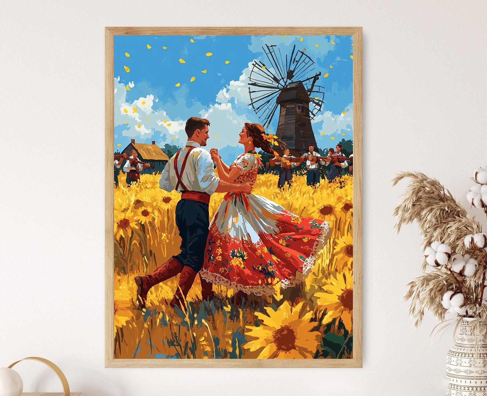 Découvrez cette affiche vibrante qui capture la joie d’un couple ukrainien dansant le Kolomyika au cœur d'un champ de tournesols dorés. L’illustration riche en couleurs, ornée de costumes folkloriques magnifiquement brodés, évoque une atmosphère festive et chaleureuse, idéale pour apporter une touche de vie à votre décoration murale. Ce poster mural, alliant tradition et émotion, est parfait pour enrichir votre art mural avec une scène pleine de mouvement et de culture.