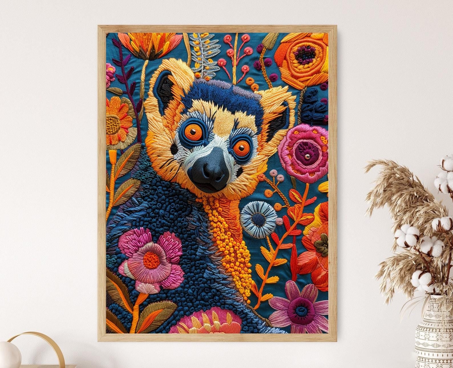 Affiche Lémurien – Poster Broderie Colorée et Nature Éveillante