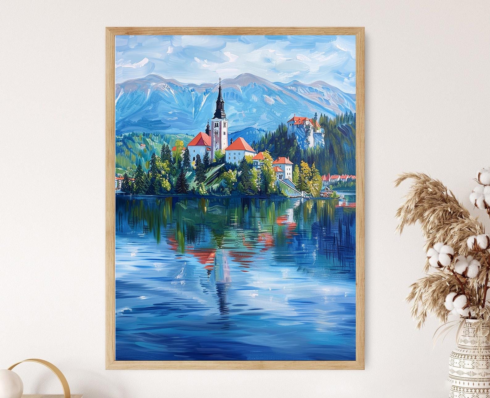 Découvrez l'affiche évocatrice du lac de Bled, où l'église pittoresque se reflète dans les eaux calmes, entourée de collines forestières apaisantes. Cette illustration sublime, avec ses tonalités douces et son ambiance sereine, invite à la contemplation et à la rêverie. Transformez votre espace avec cette décoration murale qui capture la beauté naturelle de la Slovénie et apporte une touche d'art mural inspirante à votre intérieur.