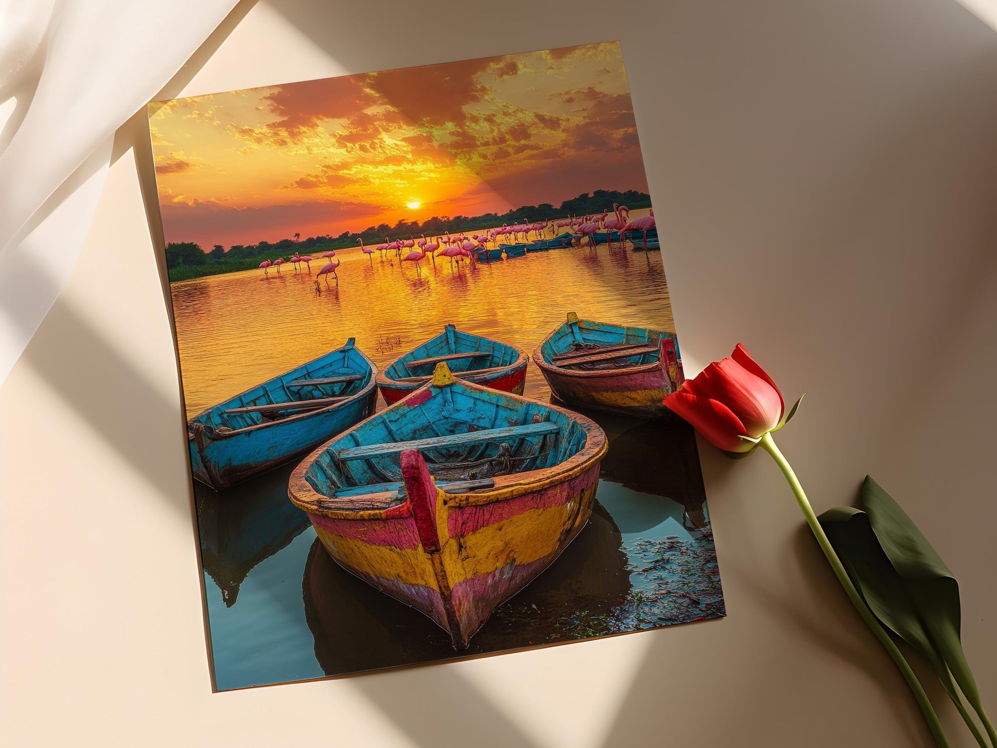 Découvrez notre affiche captivante représentant le lac Chilika en Odisha, où des bateaux colorés flottent gracieusement parmi des flamants roses et une végétation luxuriante. Cette illustration vivante évoque la sérénité et la beauté de la nature, faisant de ce poster mural une pièce maîtresse idéale pour votre décoration murale. Apportez une touche d'évasion et de fraîcheur à votre intérieur avec cet art mural inspirant.