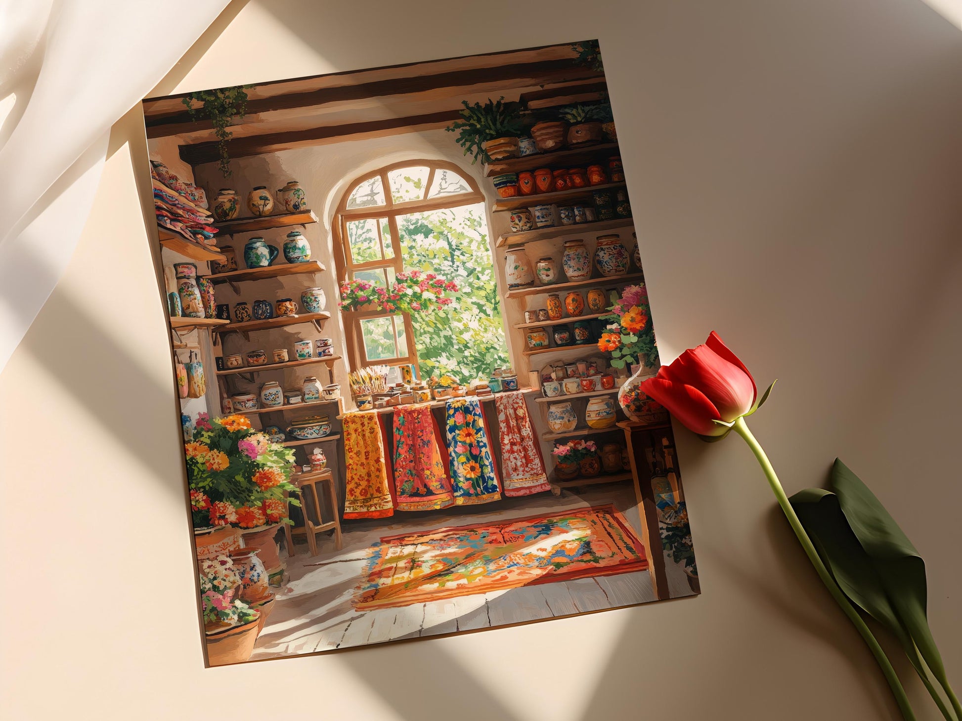 Découvrez cette magnifique affiche qui illustre la richesse culturelle d'une boutique de souvenirs à Lahore, où se mêlent les motifs colorés des châles phulkari, la beauté artisanale de la poterie peinte à la main et les délicates sculptures en bois traditionnelles. Ce poster mural, véritable œuvre d'art mural, apportera une touche d'authenticité et d'émotion à votre décoration murale, invitant à un voyage sensoriel au cœur de l'Orient. Ajoutez cette illustration vibrante à votre espace pour une ambiance chaleureuse et inspirante.