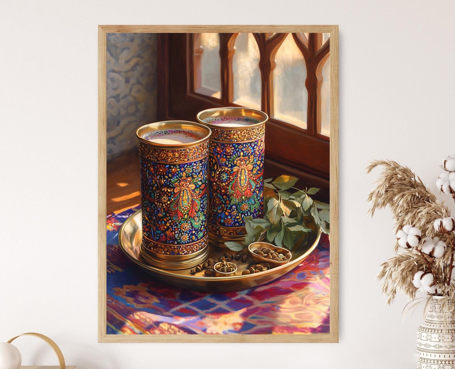 Découvrez cette magnifique affiche qui met en valeur l'élégance des verres à lassi en laiton indien, ornés de motifs Meenakari raffinés. L'illustration évoque une ambiance chaleureuse et rustique grâce à son fond en soie Bandhani, parfaite pour ajouter une touche de culture et de sophistication à votre décoration murale. Ce poster mural est une véritable œuvre d'art mural qui apportera une atmosphère apaisante et inspirante à votre intérieur.