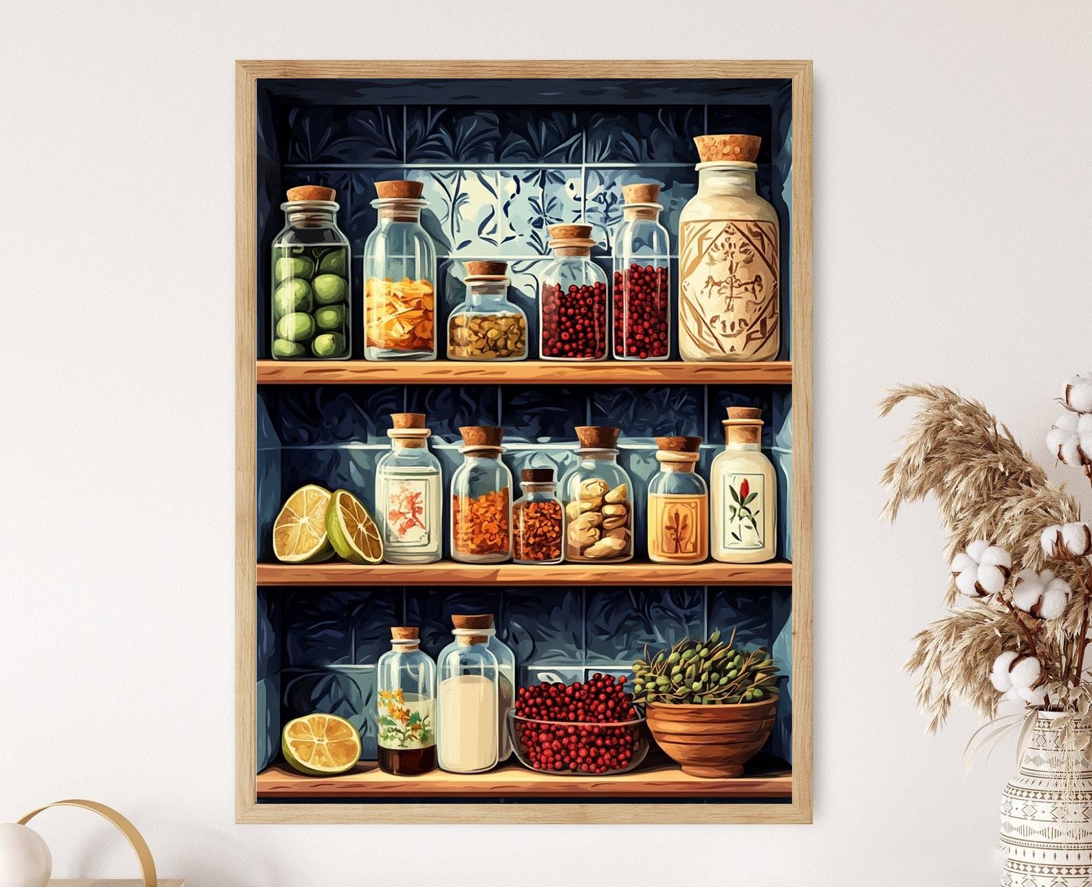 Découvrez cette magnifique affiche qui illustre un cabinet persan orné, mettant en valeur des flacons d'eau de rose, du safran et des citrons séchés sur une étagère carrelée de mosaïque. Cette décoration murale évoque un voyage sensoriel à travers les traditions herboristes d'Iran, apportant une touche d'élégance et de charme à votre intérieur. Avec ses couleurs vibrantes et son style détaillé, cet art mural est idéal pour enrichir votre espace de vie avec une illustration pleine de caractère et d'histoire.
