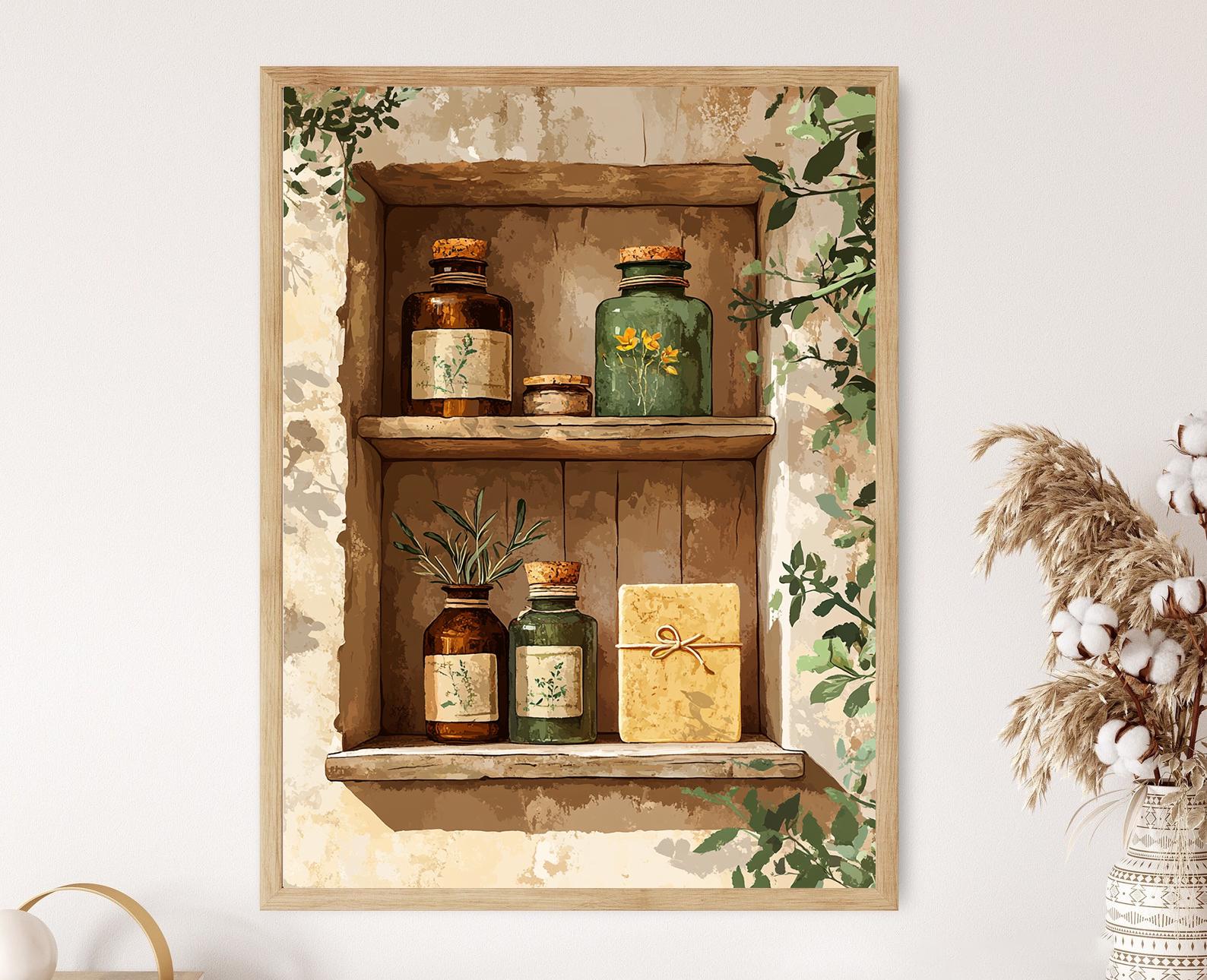 Découvrez une affiche captivante mettant en valeur un cabinet indien vibrant, orné de jarres en laiton remplies d'herbes ayurvédiques et de savons au lait de chameau, le tout baigné dans la chaleur d'un mur rajasthani. Cette illustration pleine de couleurs et de textures ajoute une touche d'exotisme et une ambiance chaleureuse à votre décoration murale, parfaite pour enrichir votre art mural et transformer votre espace en un véritable havre de paix. Laissez-vous emporter par l'émotion et la richesse visuelle de cette œuvre unique, idéale pour donner du caractère à vos murs.