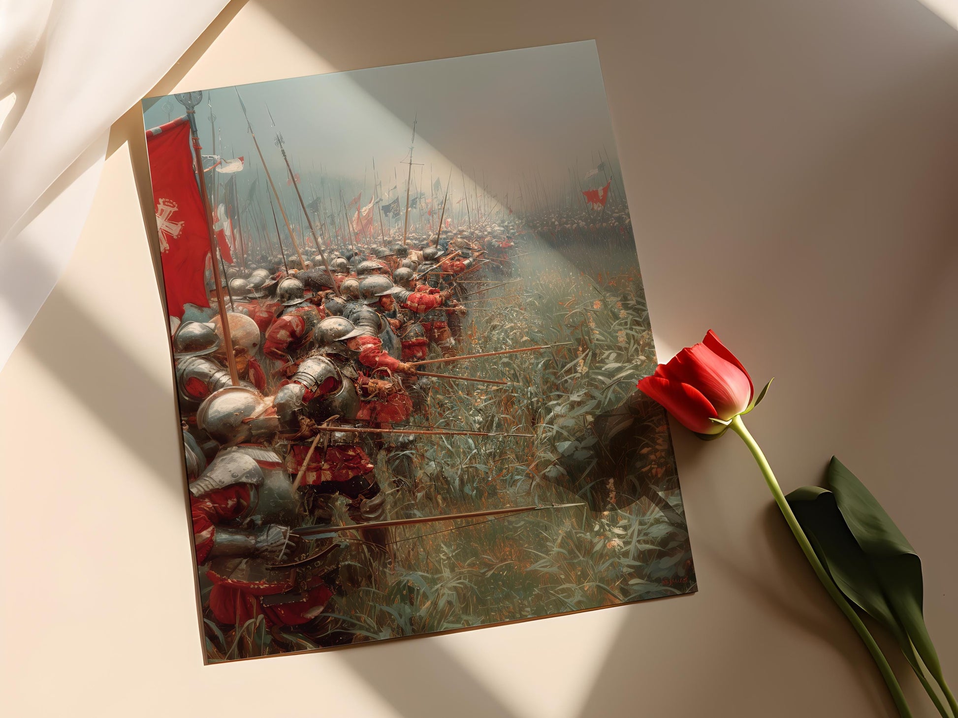 Découvrez notre affiche médiévale inspirée des célèbres archers d'Agincourt, une illustration captivante qui évoque la bravoure et la stratégie de cette époque emblématique. Avec son style riche en détails et son ambiance historique, ce poster mural devient une véritable décoration murale qui apportera une touche d'élégance et de mystère à votre art mural. Plongez dans l'univers des chevaliers et des batailles épiques avec cette œuvre qui stimule l'imagination et enrichit votre espace.