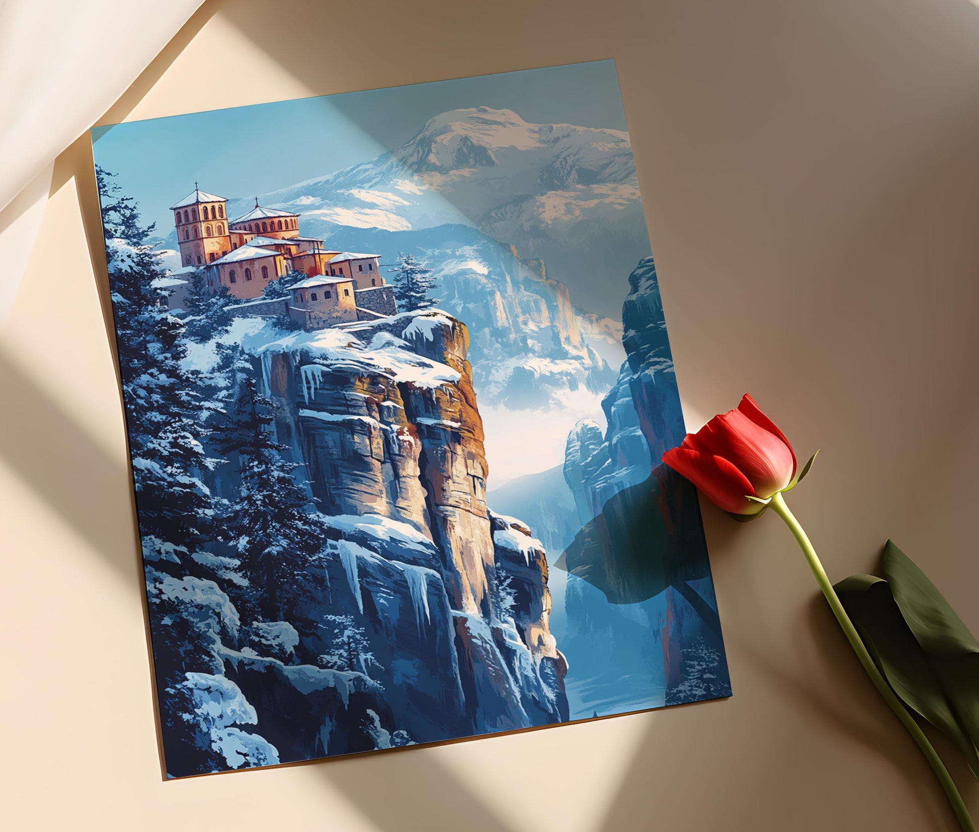 Affiche Météores en Hiver – Poster de Paysage Grec Sous la Neige