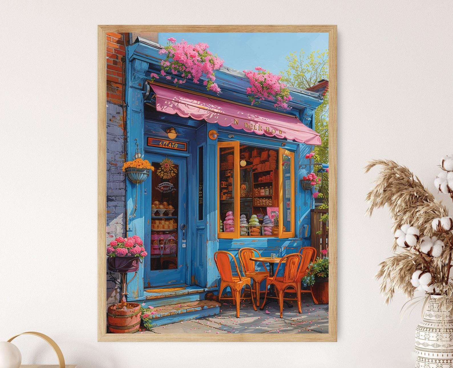 Découvrez l'élégance d'une boutique de gelato avec cette magnifique affiche qui capture la joie et la couleur d'un glacier animé. L'illustration évoque une atmosphère festive grâce à ses teintes vives et ses détails charmants, faisant de ce poster mural une pièce de décoration murale parfaite pour insuffler une touche de fraîcheur et de bonheur à votre espace. Ajoutez cet art mural à votre collection pour une ambiance chaleureuse et accueillante.