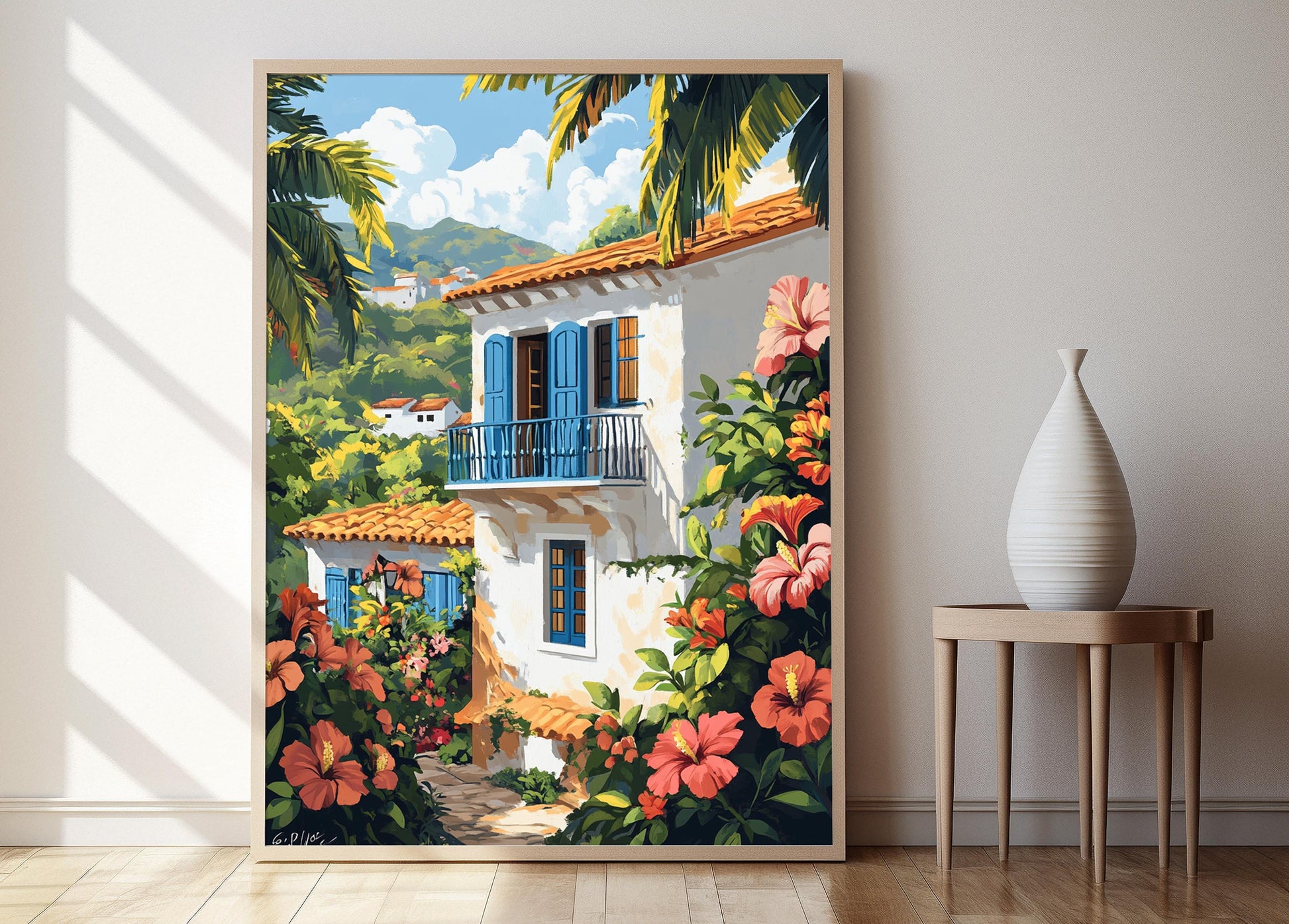 Affiche Maison Coloniale Brésilienne – Art Tropical avec Hibiscus