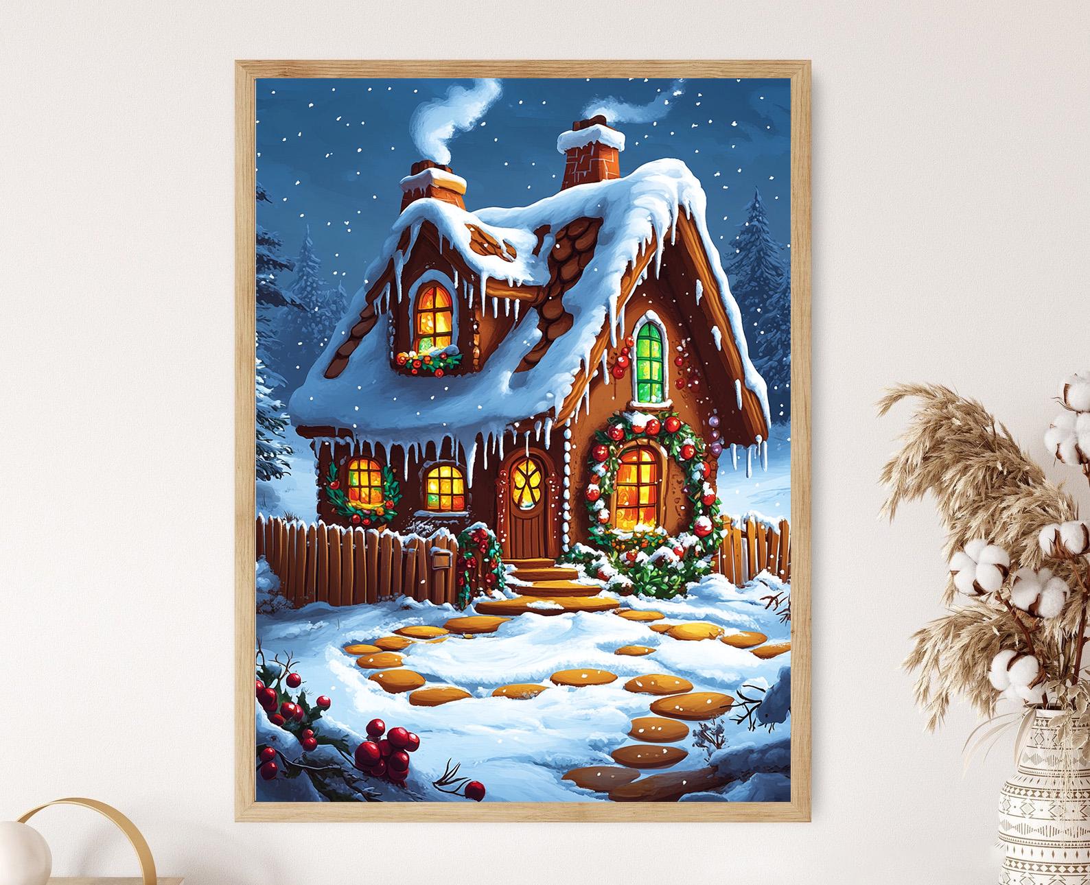 Découvrez cette magnifique affiche illustrant un cottage en pain d'épice de style victorien, revêtu de fenêtres en verre de sucre et de tuiles en bonbon à la menthe, le tout enveloppé dans un paysage hivernal enchanteur. Ce poster mural évoque une atmosphère chaleureuse et féerique, parfaite pour embellir votre décoration murale durant les fêtes. L'illustration, riche en détails et en couleurs vibrantes, apportera une touche de magie et de charme à votre espace.