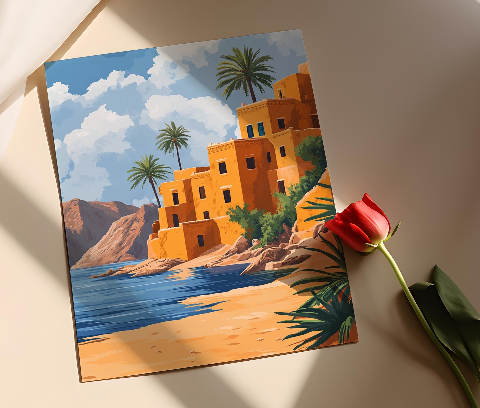 Découvrez cette magnifique affiche qui met en avant les maisons nubiennes emblématiques du Soudan, ornées de motifs géométriques colorés. Cette illustration captivante évoque la sérénité et la richesse du patrimoine culturel soudanais, faisant de ce poster mural une pièce idéale pour enrichir votre décoration murale et apporter une touche d'ethnicité à votre art mural. Laissez-vous transporter par la beauté de cette œuvre qui célèbre la proximité du majestueux fleuve Nil.