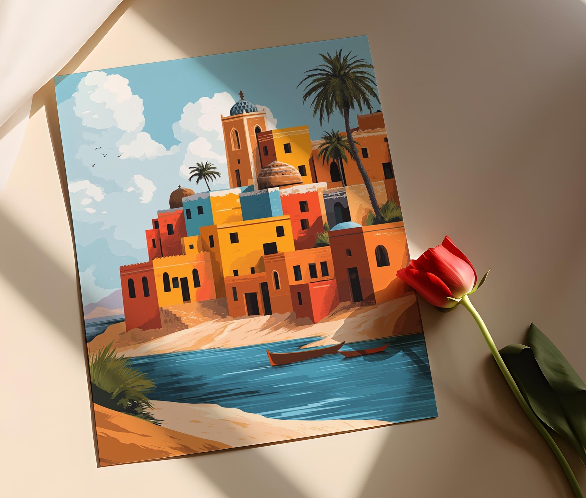 Découvrez cette affiche captivante qui met en valeur les maisons nubiennes du Soudan, avec leurs motifs géométriques colorés évoquant la beauté de la culture locale. Cette illustration vibrante apporte une touche d’authenticité et de sérénité à votre décoration murale, idéale pour ceux qui recherchent un art mural unique et ethnique. Transformez votre intérieur en un espace inspirant grâce à ce poster mural chargé d'émotion et de tradition.