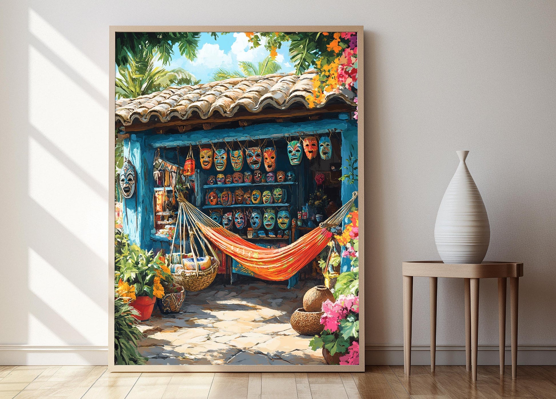 Plongez dans l'ambiance colorée d'un mercado brésilien avec cette affiche captivante, qui met en avant des hamacs tissés, des céramiques peintes et des masques en bois. Cette illustration vibrante évoque la joie et la chaleur du Brésil, faisant de ce poster mural une pièce maîtresse idéale pour votre décoration murale. Apportez un souffle d'exotisme et de créativité à votre art mural avec cette œuvre inspirante.