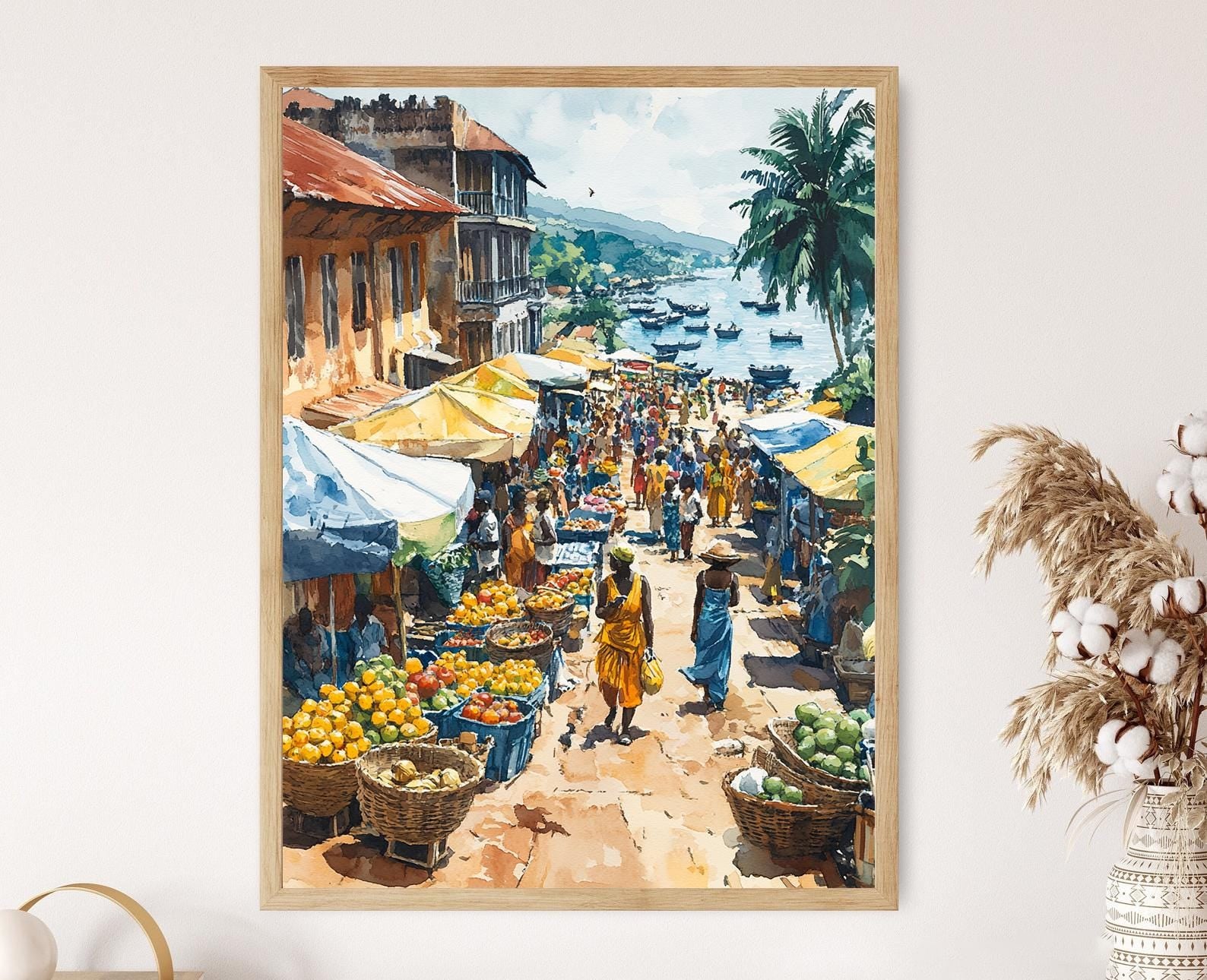 Affiche Marché de Douala – Illustration Fruits Tropicaux et Tissus