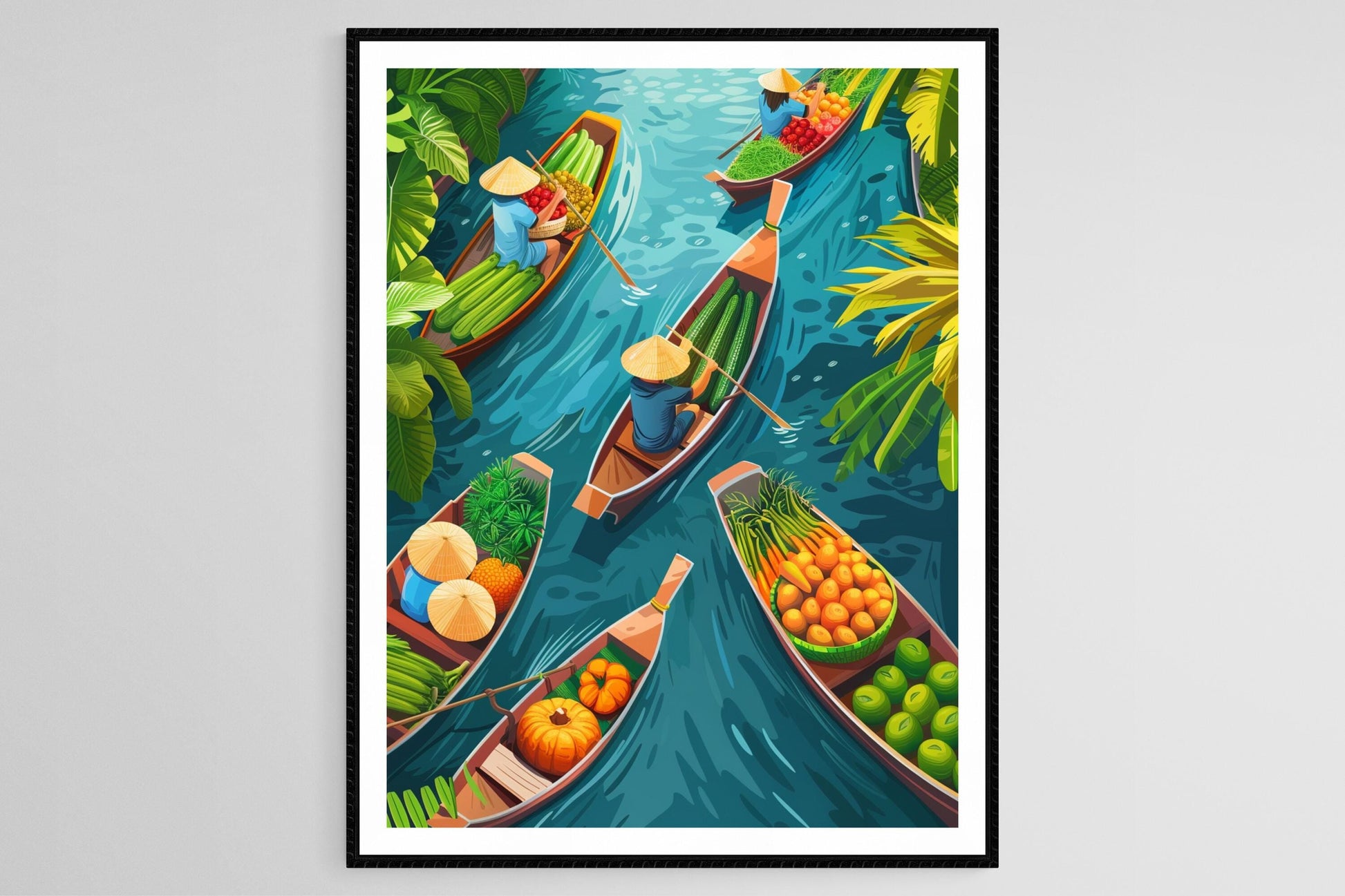 Découvrez cette magnifique affiche qui illustre l'atmosphère animée d'un marché flottant thaïlandais. Avec ses bateaux colorés débordant de produits frais et son arrière-plan de verdure luxuriante, cette décoration murale évoque une expérience culturelle unique et captivante. Parfaite pour enrichir votre intérieur, cette illustration apporte une touche d'exotisme et de vie à votre art mural.