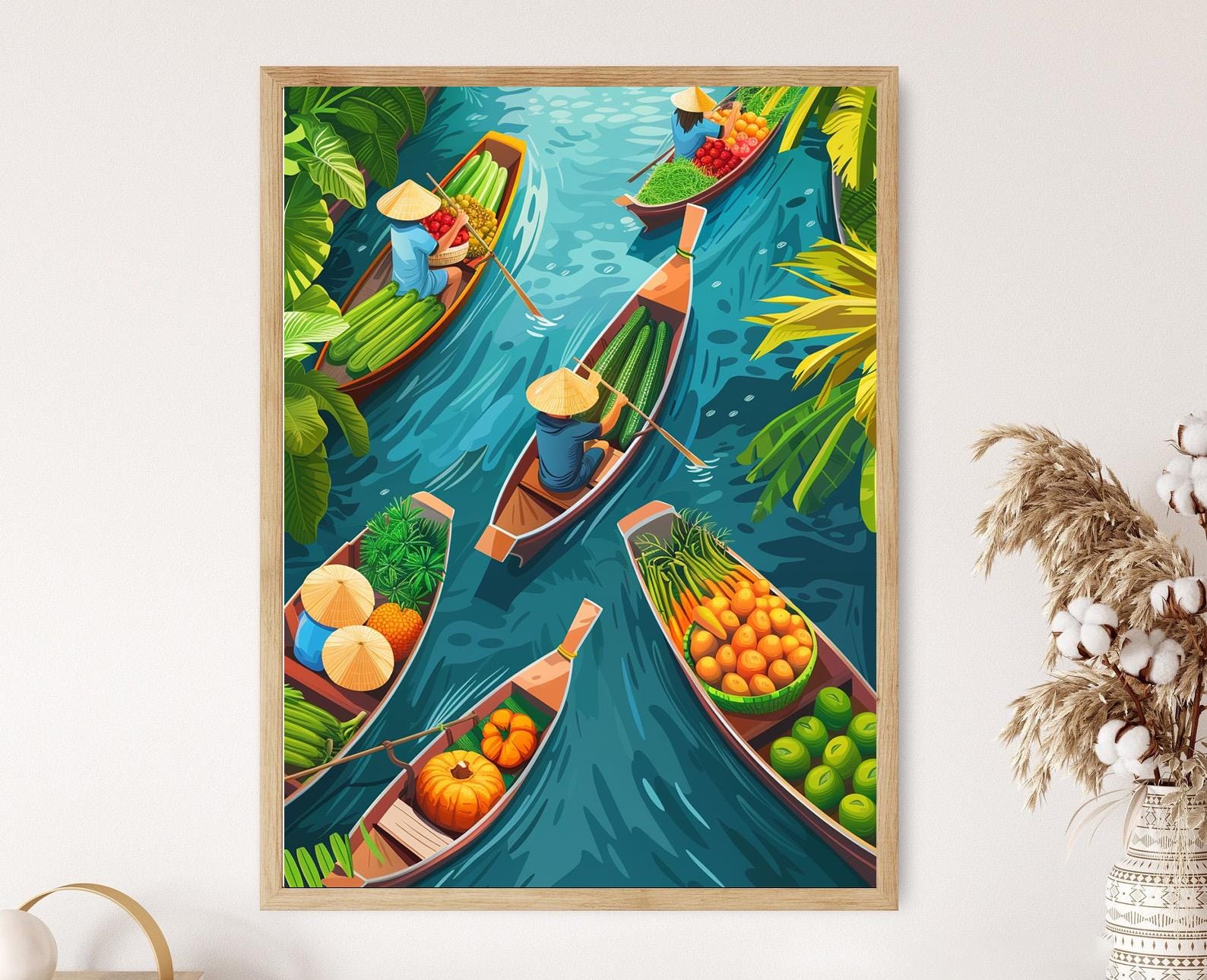 Affiche Marché Flottant Thaï – Poster Vibrantes Bateaux et Délices Locaux