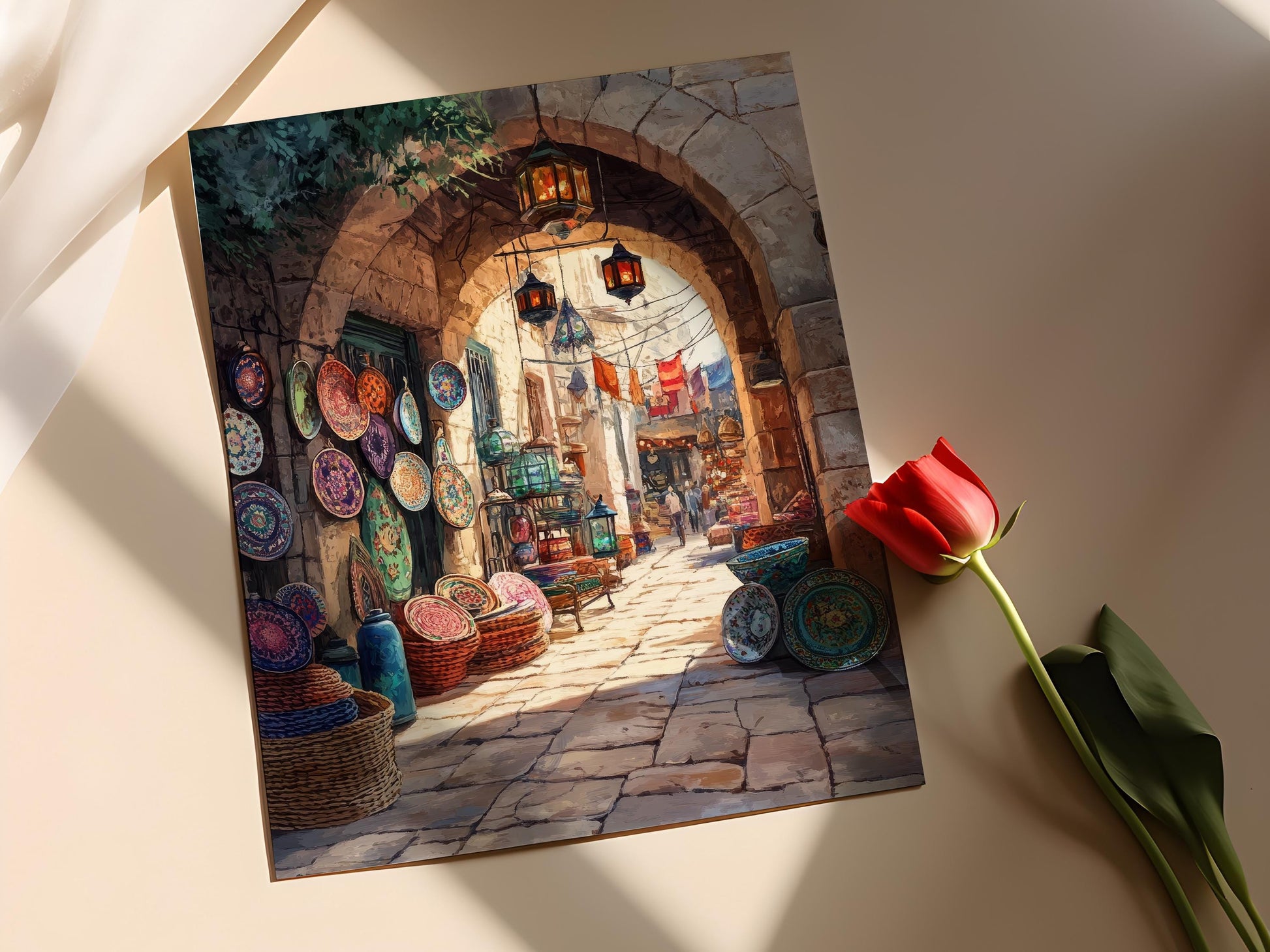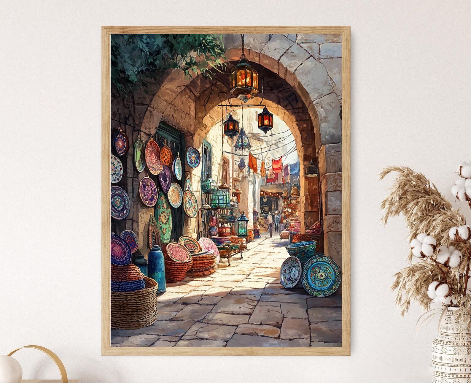 Découvrez notre affiche captivante qui illustre le marché artisanal de Tulkarm, où des broderies palestiniennes traditionnelles, des assiettes en céramique et des paniers tissés sont exposés sous des arches en pierre historiques. Cette décoration murale évoque une ambiance chaleureuse et authentique, invitant à un voyage sensoriel au cœur de la culture de la Cisjordanie. Avec cette illustration vibrante, transformez votre espace en un véritable tableau d’art mural empreint de charme et de caractère.