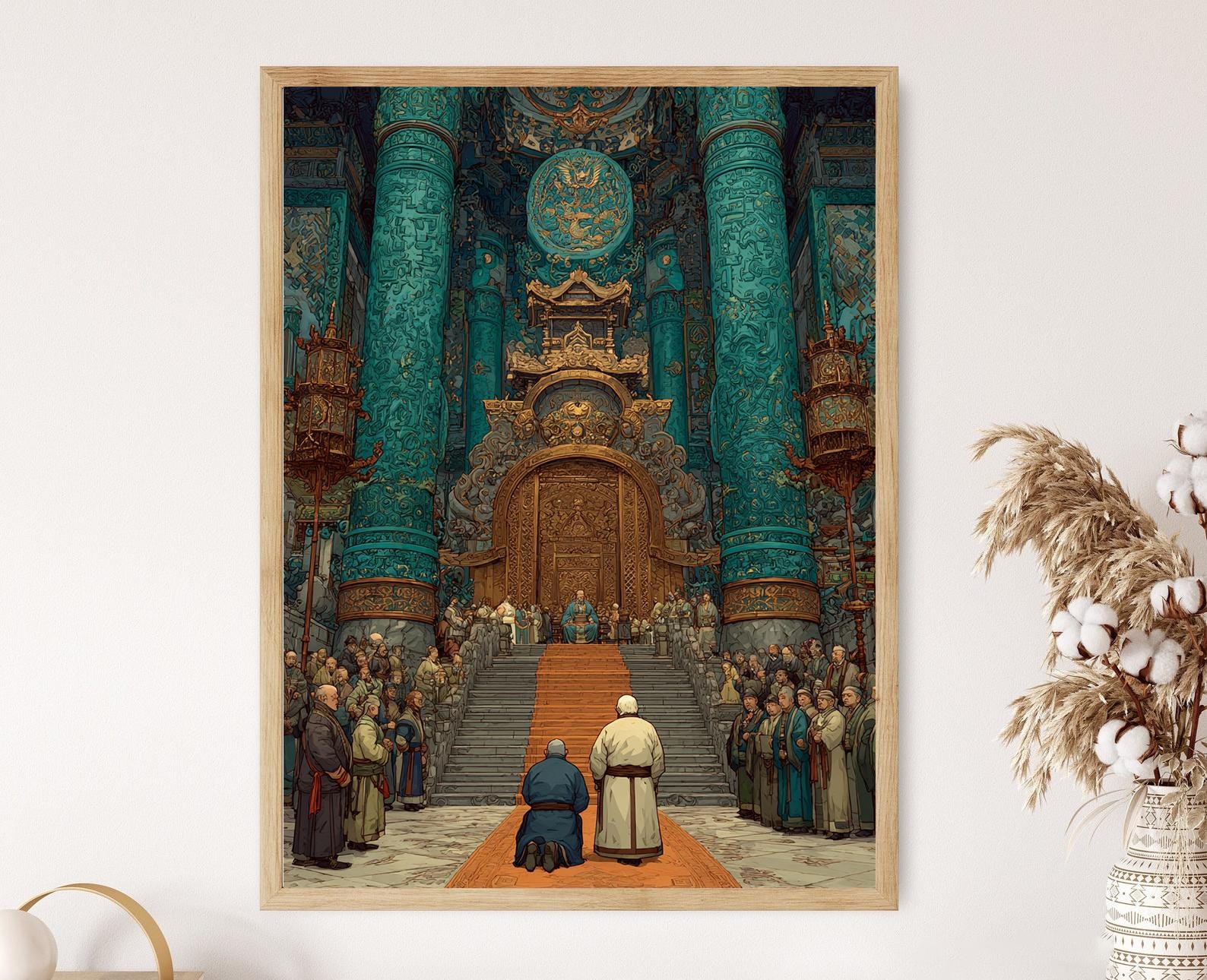 Découvrez cette affiche captivante qui illustre Marco Polo à la cour de Kublai Khan, une scène riche en cultures et en élégance impériale. Avec un style artistique raffiné, ce poster mural évoque une atmosphère de découverte et d'aventure, invitant à une immersion dans un monde de soie et de jade. Parfait pour toute décoration murale, cette illustration apportera une touche d'histoire et de mystère à votre art mural.