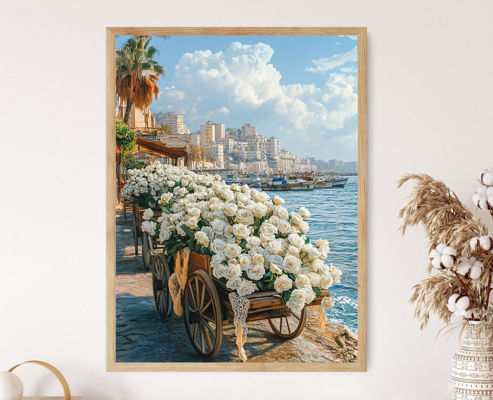 Découvrez notre affiche captivante qui met en valeur des chariots de bouquets de mariage gazaouis, ornés de roses blanches, de jasmins et de lys, enveloppés dans des dentelles et des rubans dorés. Cette illustration évoque une atmosphère romantique, baignée dans la lumière douce de l'aube, parfaite pour une décoration murale qui apportera caractère et charme à votre intérieur. Avec son style élégant et culturel, ce poster mural transforme n'importe quel espace en une œuvre d'art inspirante.