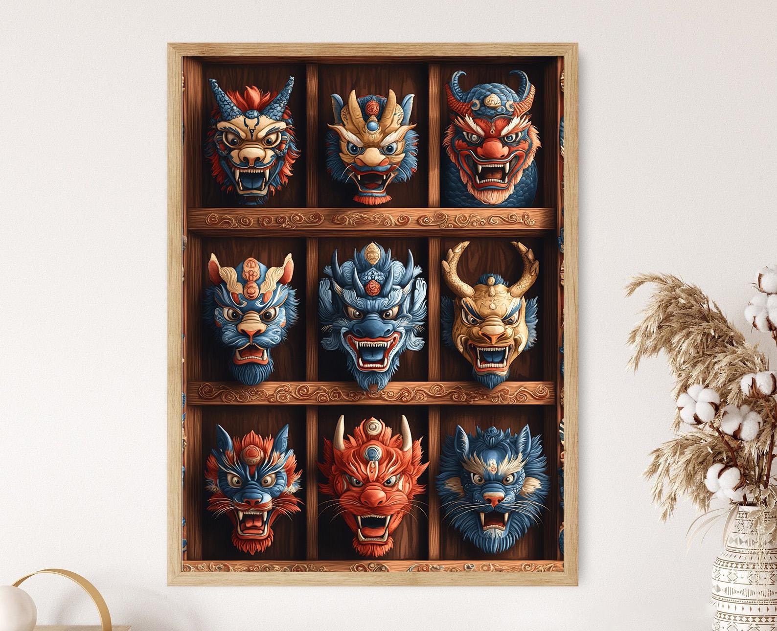 Affiche Masque Animal Spirituel Tibétain – Illustration Folklore en Bois