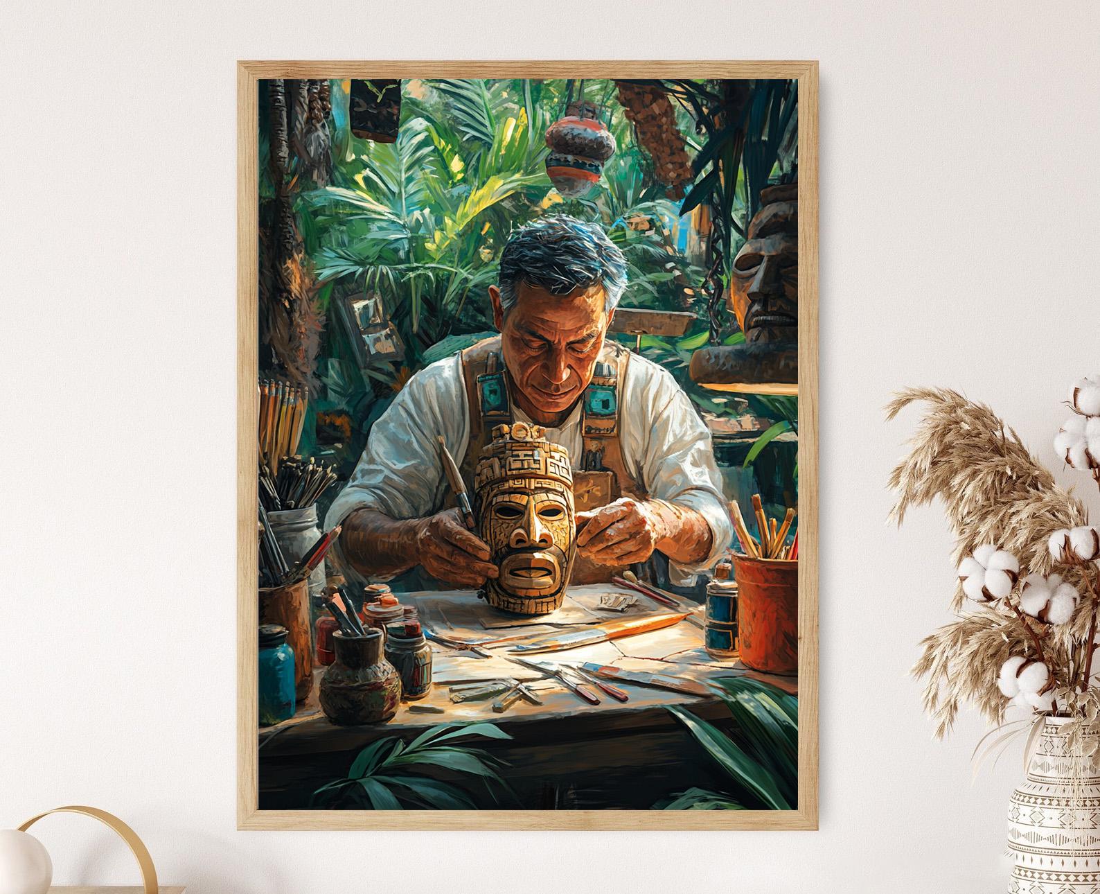 Découvrez notre affiche captivante mettant en scène un artisan totonac en pleine création d'un masque cérémoniel en bois, enveloppé de couleurs vives et d'outils traditionnels. Cette illustration riche en détails évoque l'héritage artistique de Veracruz, apportant une touche d'authenticité et de chaleur à votre décoration murale. Transformez votre espace avec ce poster mural qui célèbre la créativité et la passion des artisans, parfait pour toute ambiance d'art mural.