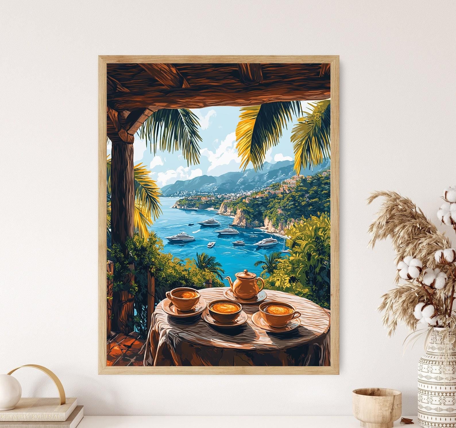 Découvrez l'élégance tropicale de cette affiche illustrant les molletes et le café de olla sur un balcon rustique, avec une vue enchanteresse sur la baie d'Acapulco. Ce poster mural évoque une atmosphère chaleureuse et relaxante, ornée de palmiers et d'eaux cristallines, parfaite pour apporter une touche d'évasion à votre décoration murale. L'illustration vibrante capture l'essence d'un moment idyllique, faisant de cet art mural un ajout idéal à votre intérieur.