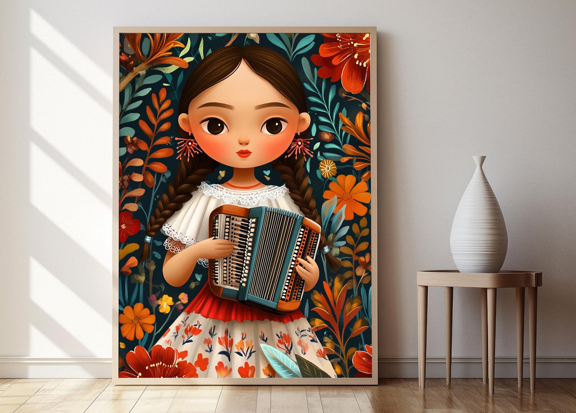 Affiche Muñeca Costaricaine avec Accordéon – Poster Floral Traditionnel