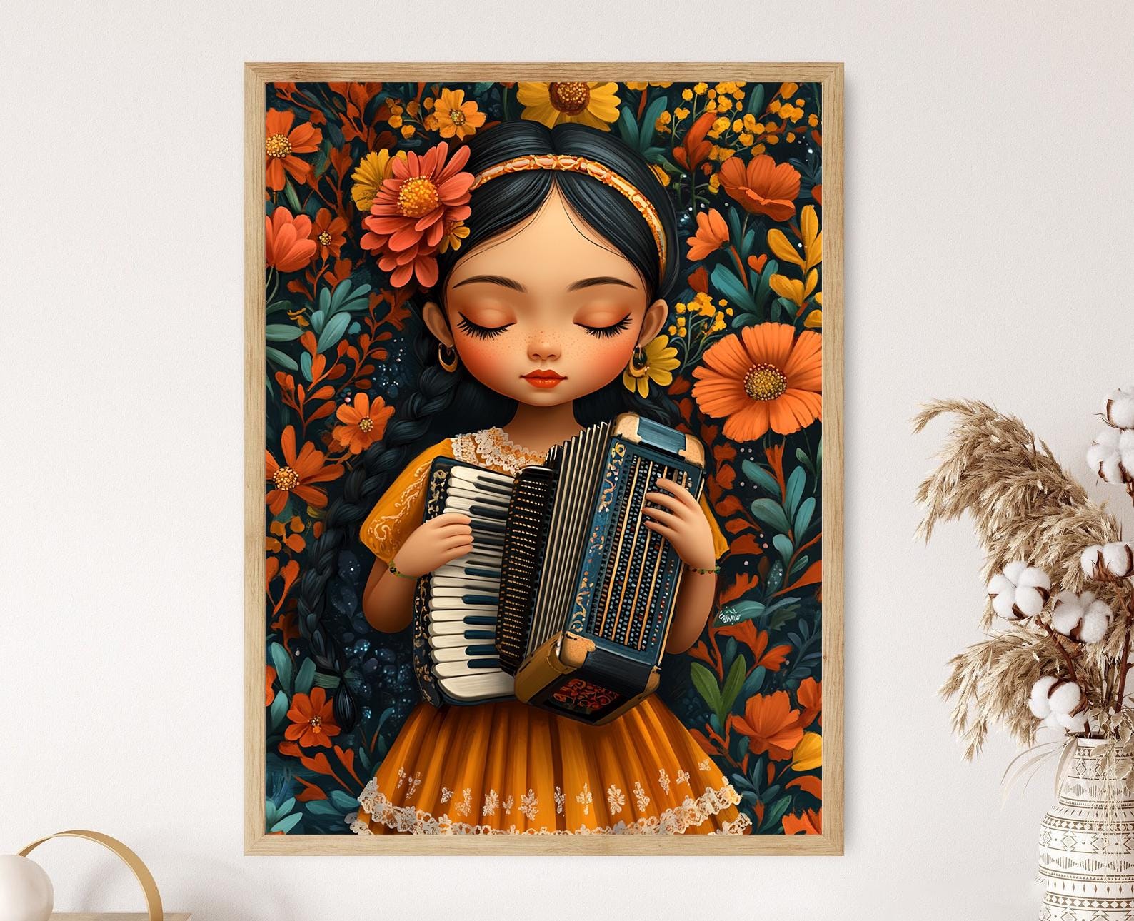 Découvrez cette affiche vibrante qui met en lumière une muñeca panaméenne, élégamment vêtue d'une pollera traditionnelle et jouant de l'accordéon. L'illustration, entourée d'un fond floral, évoque la richesse culturelle et les traditions festives du Panama, apportant une touche joyeuse et colorée à votre décoration murale. Idéale en tant que poster mural, elle insufflera une atmosphère chaleureuse et festive à votre art mural.