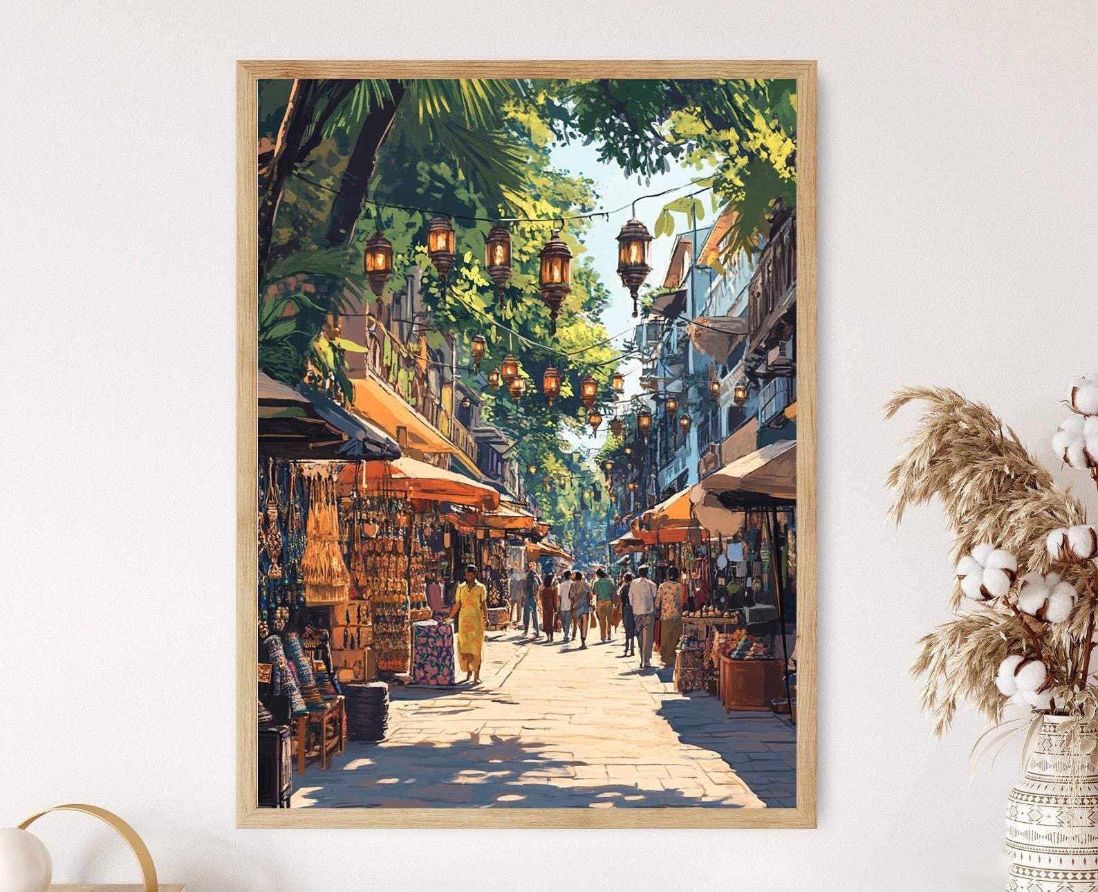 Découvrez cette magnifique affiche illustrant le Colaba Causeway à Mumbai, où des étals en bois vibrants regorgent de bijoux, de lampes en laiton et de textiles sous des arbres tropicaux. Cette illustration colorée capture l'énergie et l'animation de l'une des rues commerçantes les plus emblématiques de la ville, apportant une touche d'exotisme et de charme à votre décoration murale. Parfaite en tant que poster mural, elle rehaussera sans effort l'art mural de votre intérieur avec ses détails riches et ses couleurs éclatantes.