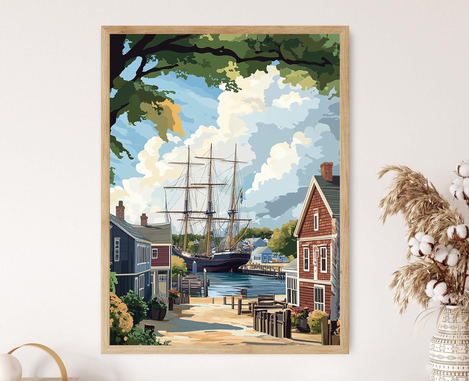 Découvrez cette magnifique affiche qui évoque le charme intemporel de Mystic Seaport, avec ses grands voiliers majestueux, ses docks en bois et ses bâtiments côtiers. Cette illustration, empreinte de l'esprit maritime de la Nouvelle-Angleterre, apporte une touche d'authenticité à votre décoration murale. Parfaite pour les amateurs d'histoire et de décoration côtière, ce poster mural transforme votre espace en une véritable ode à l'aventure maritime.