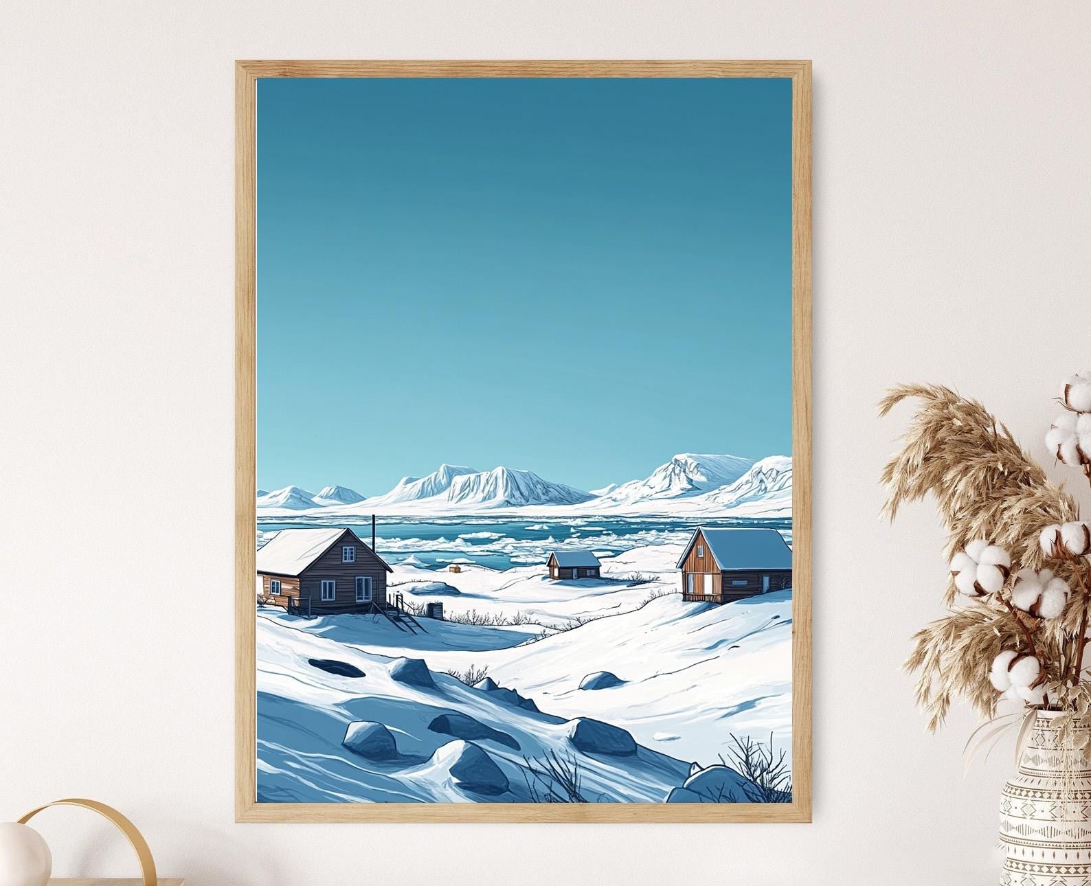 Découvrez cette magnifique affiche qui évoque la beauté majestueuse de la toundra enneigée du Nunavut. Avec ses plaines blanches à perte de vue et ses montagnes glacées se profilant sous un ciel bleu cristallin, cette illustration est une véritable célébration des paysages nordiques canadiens. Parfaite pour sublimer votre décoration murale, cet art mural apporte une touche de sérénité et d'évasion à votre intérieur.