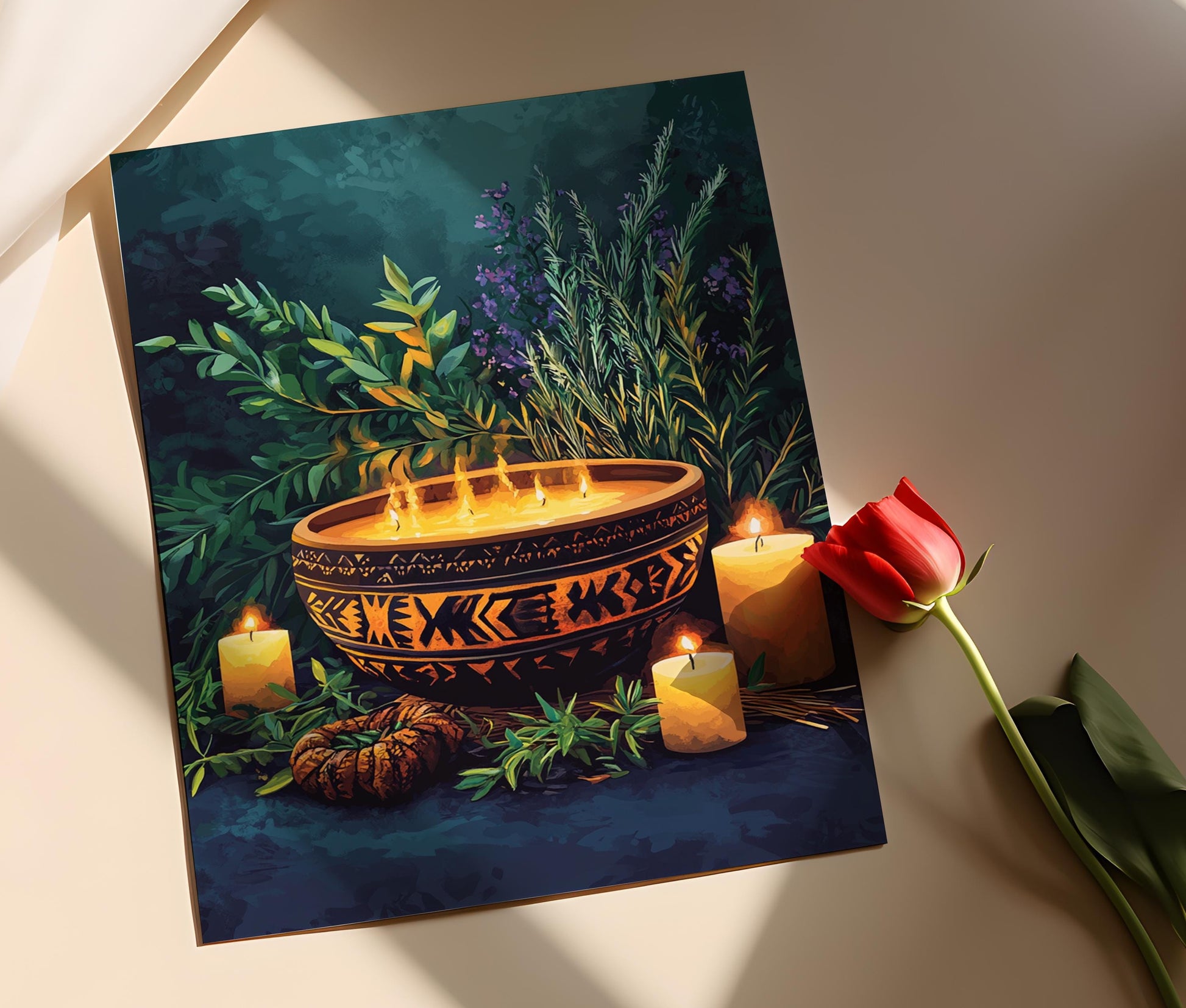 Découvrez cette affiche captivante qui met en scène un bol d'obeah jamaïcain orné de symboles tribaux peints à la main, de plantes aromatiques et de bougies. Cette illustration fascinante offre une plongée dans les traditions spirituelles et le folklore vibrant de la Jamaïque, ajoutant une touche mystique et culturelle à votre décoration murale. Parfaite pour les amateurs d’art mural, elle évoque une émotion unique et une connexion avec les racines caribéennes.