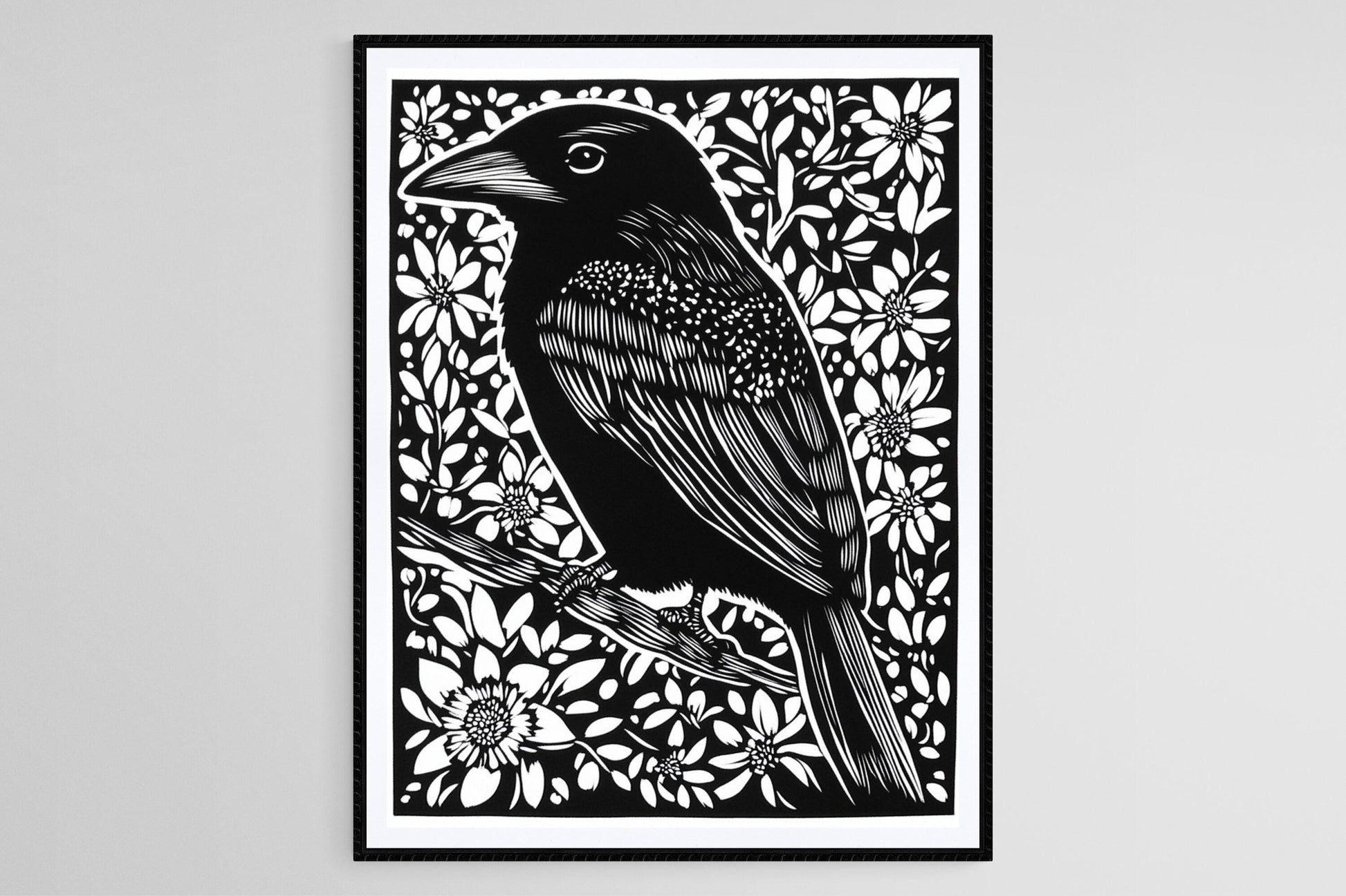 Affiche Oiseau – Poster Linogravure sur Fond Floral Noir et Blanc