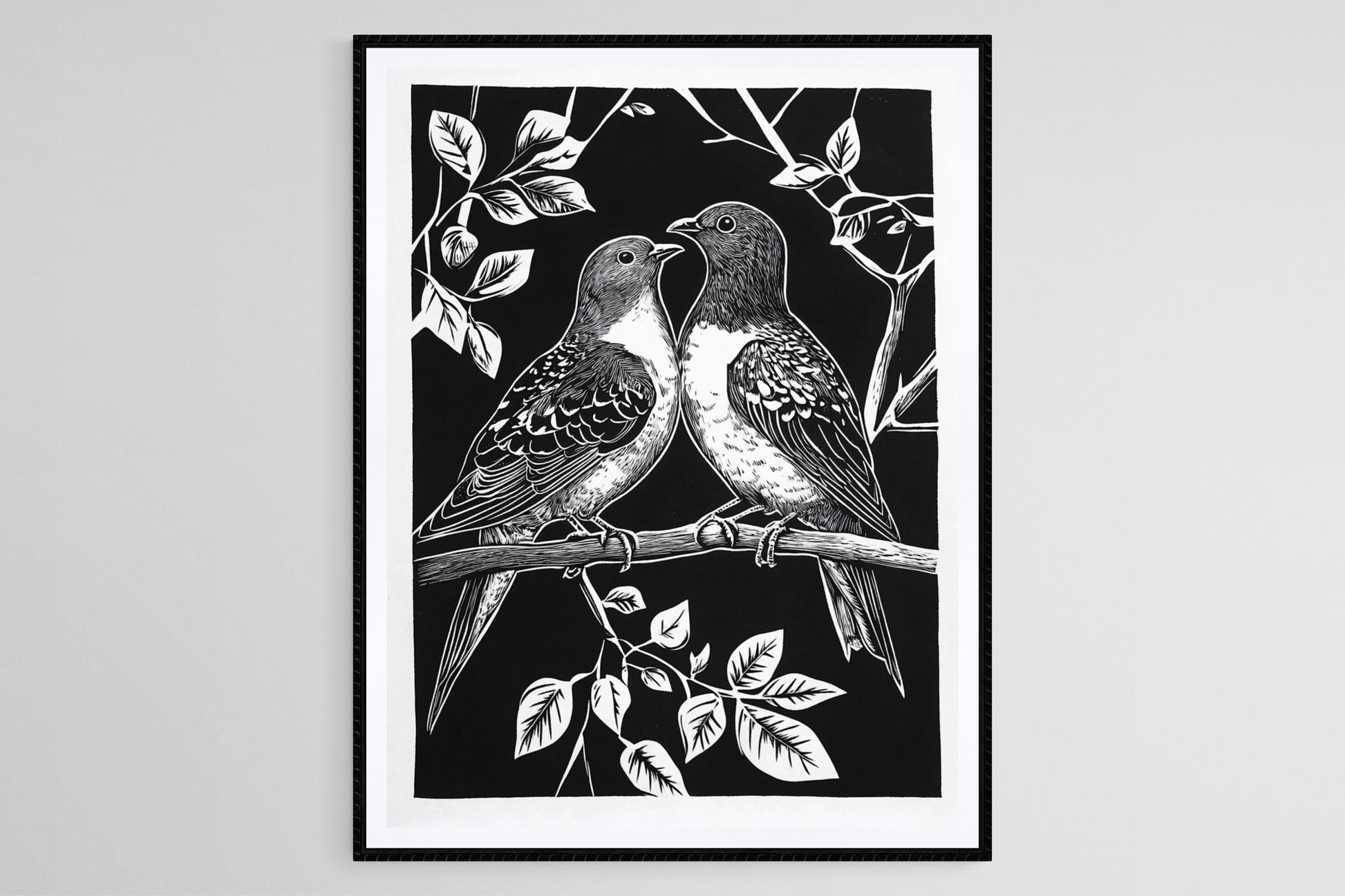 Affiche Oiseaux – Poster Linogravure Noir et Blanc, Art Nature Artisanale