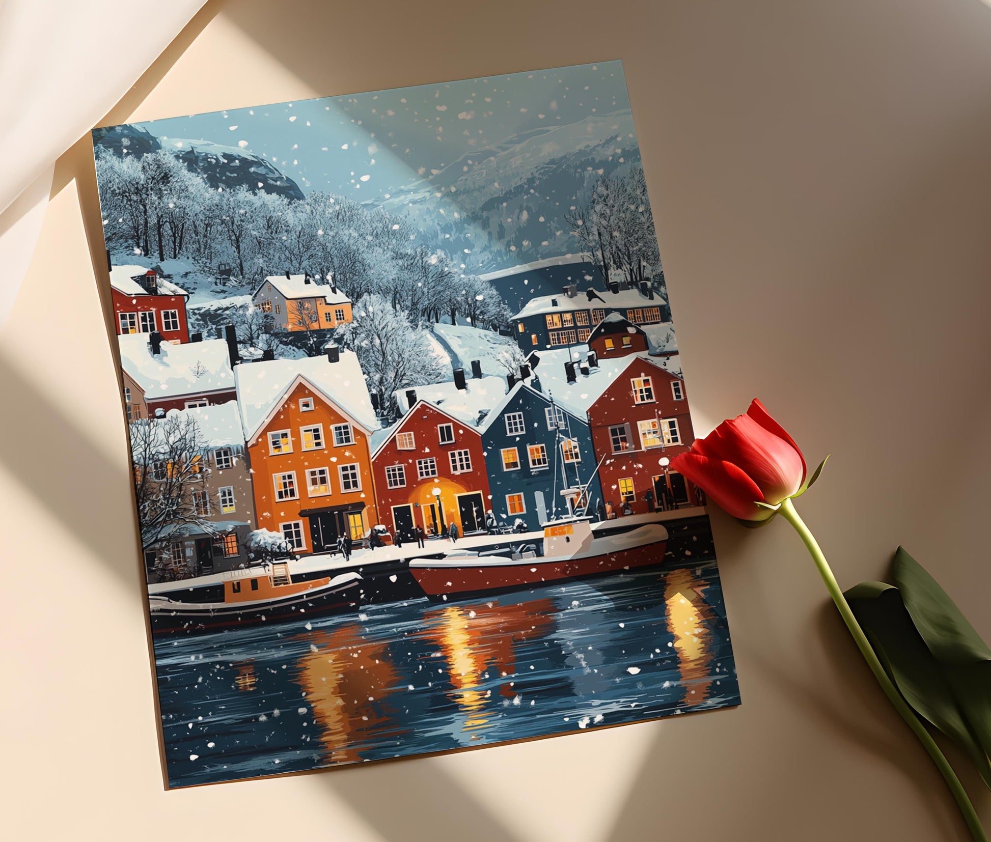 Découvrez notre affiche "Oslo Hiver", une illustration captivante qui transporte l'observateur au cœur d'une ville fjord enneigée. Ce poster mural évoque la sérénité et la beauté hivernale à travers des teintes douces et des paysages apaisants, créant une atmosphère chaleureuse idéale pour toute décoration murale. L’art mural de ce tableau inspire une douce mélancolie, invitant à la rêverie et à l’évasion.