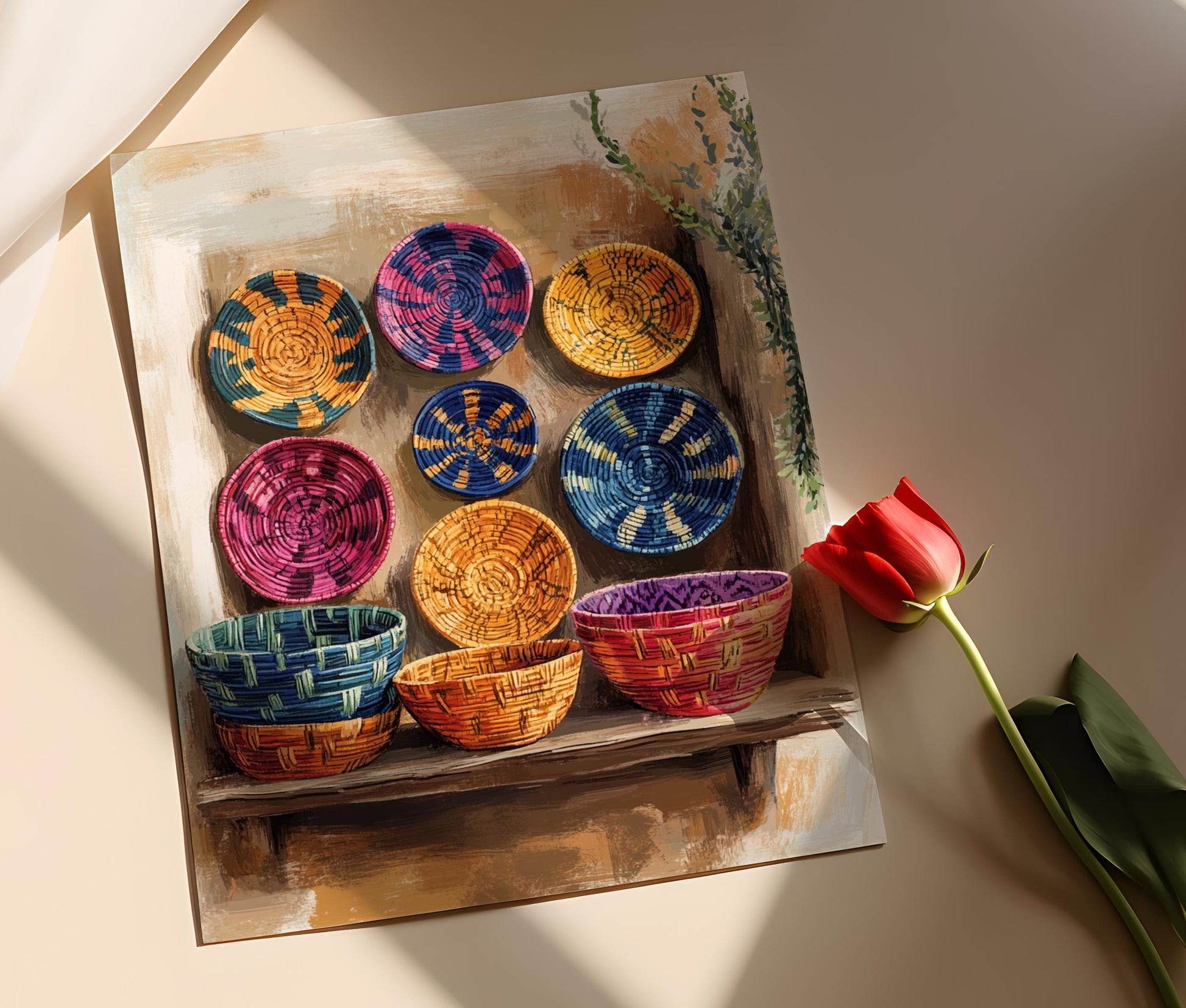 Découvrez cette magnifique affiche mettant en avant des paniers tissés vibrants du Ghana, ornés de motifs raffinés qui célèbrent le savoir-faire artisanal. Cette illustration colorée, posée sur un fond rustique, apporte une touche d'authenticité à votre décoration murale et éveille des émotions chaleureuses. Parfaite pour enrichir votre espace avec un art mural inspirant, elle invite à l'évasion et à l'appréciation de la culture ghanéenne.