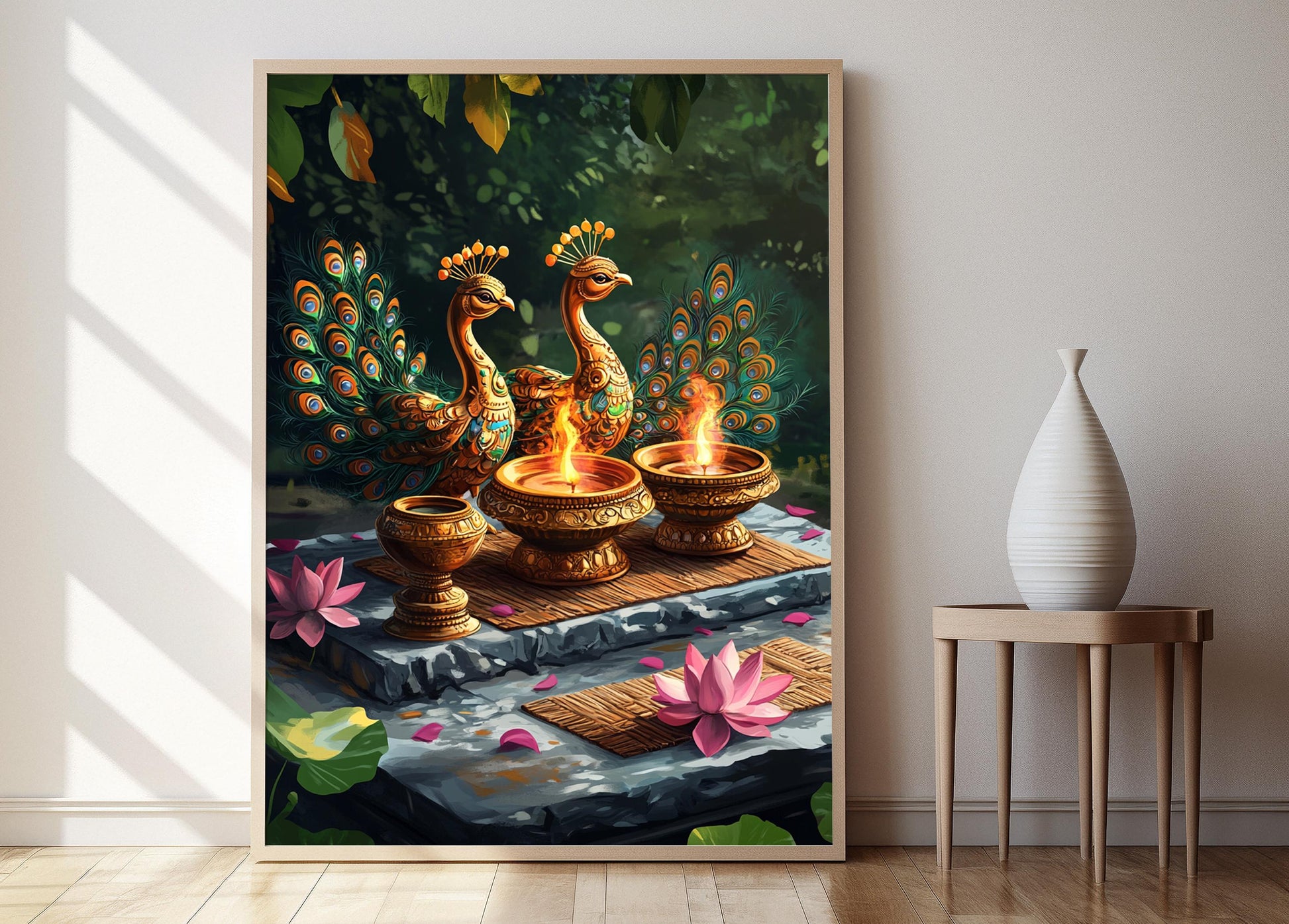 Découvrez cette magnifique affiche qui présente des lampes à huile en laiton népalais délicatement sculptées en forme de paon, ornées de motifs folkloriques. Entourées de pétales de lotus et de nattes tressées, cette illustration évoque la richesse de l'art népalais et apporte une touche d'élégance à votre décoration murale. Idéale pour embellir votre intérieur, ce poster mural transmet une ambiance chaleureuse et exquise.