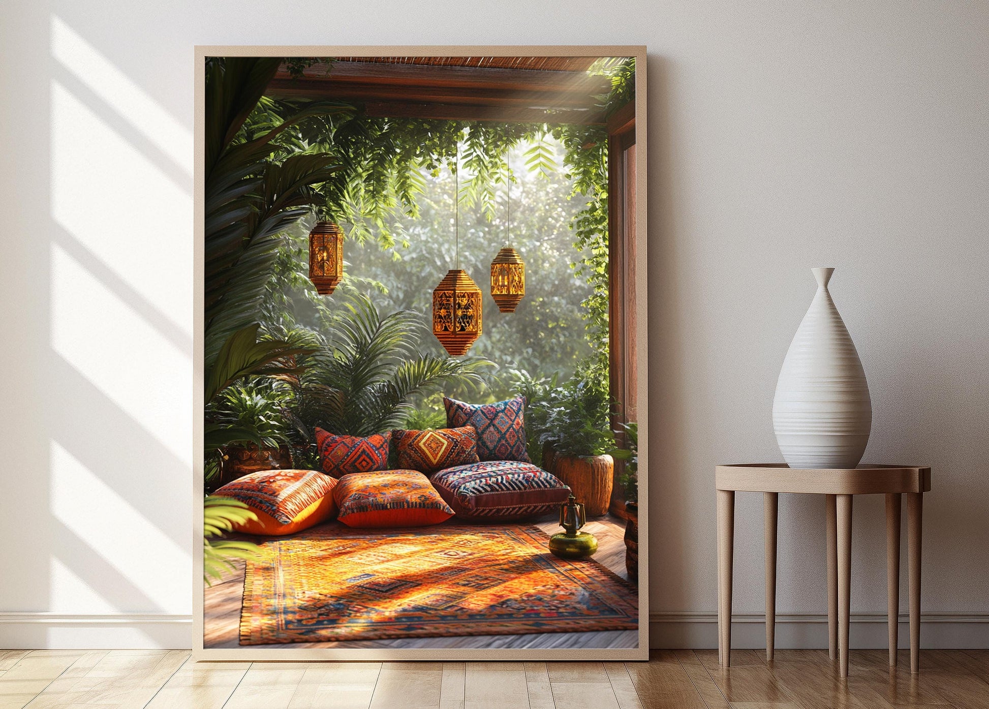 Plongez dans l'atmosphère chaleureuse et accueillante de cette affiche inspirée des toits de Medan, où des coussins au motif songket, des lanternes en laiton et des nattes tissées se mêlent harmonieusement. Cette illustration évoque une élégance intemporelle tout en célébrant la richesse culturelle de l'Indonésie, faisant de ce poster mural une pièce essentielle pour toute décoration murale. Laissez-vous séduire par cette œuvre d'art mural qui transformera votre espace en un havre de paix empreint de traditions.