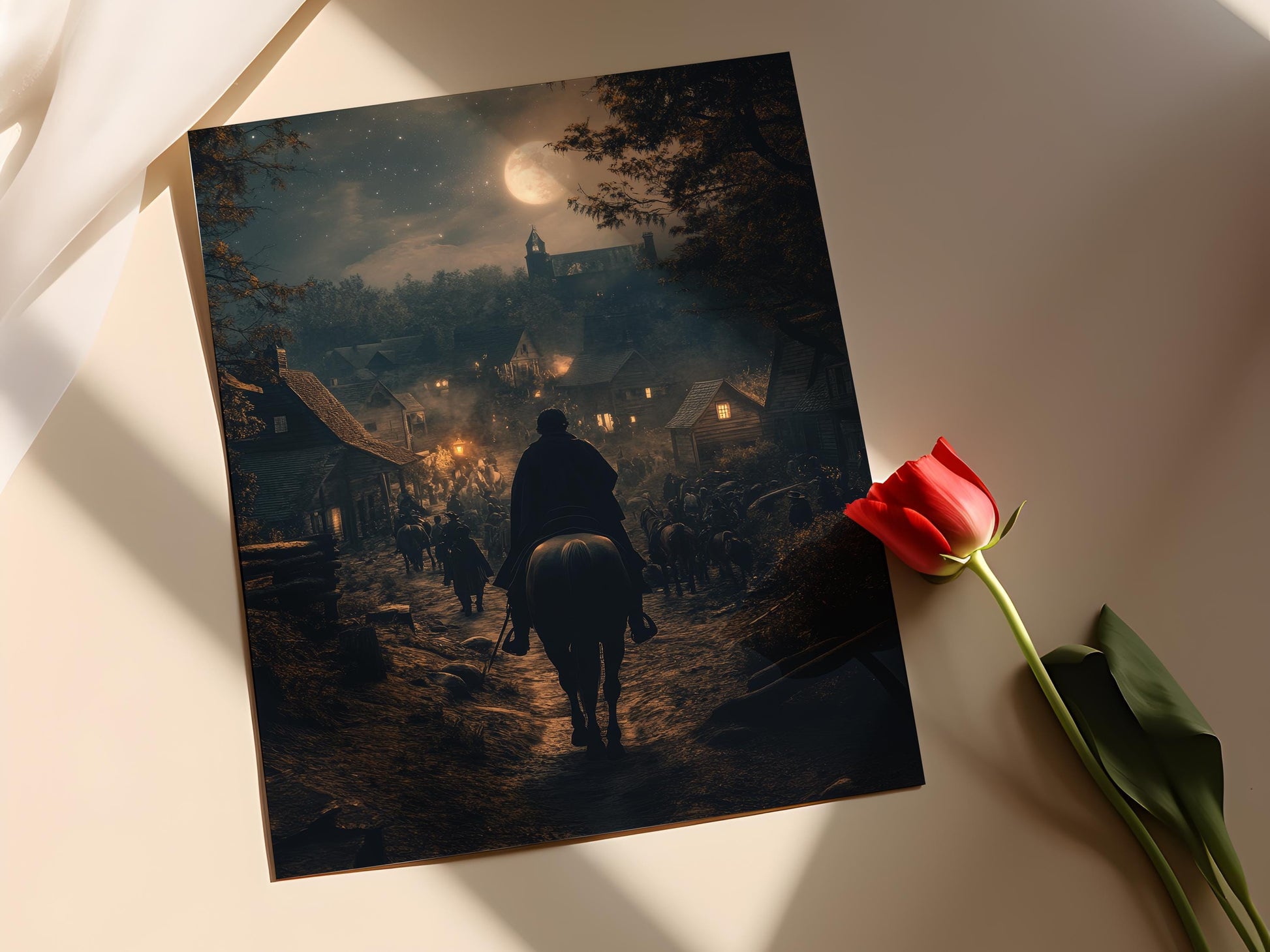 Découvrez notre affiche captivante illustrant la chevauchée nocturne de Paul Revere, un symbole puissant de bravoure et de résistance. Cette illustration dynamique, baignée par la lumière de la lune, évoque un sentiment d'urgence et de détermination, parfaite pour une décoration murale qui inspire l'esprit révolutionnaire. Idéale comme poster mural, elle apportera une touche d'art mural unique à votre intérieur.